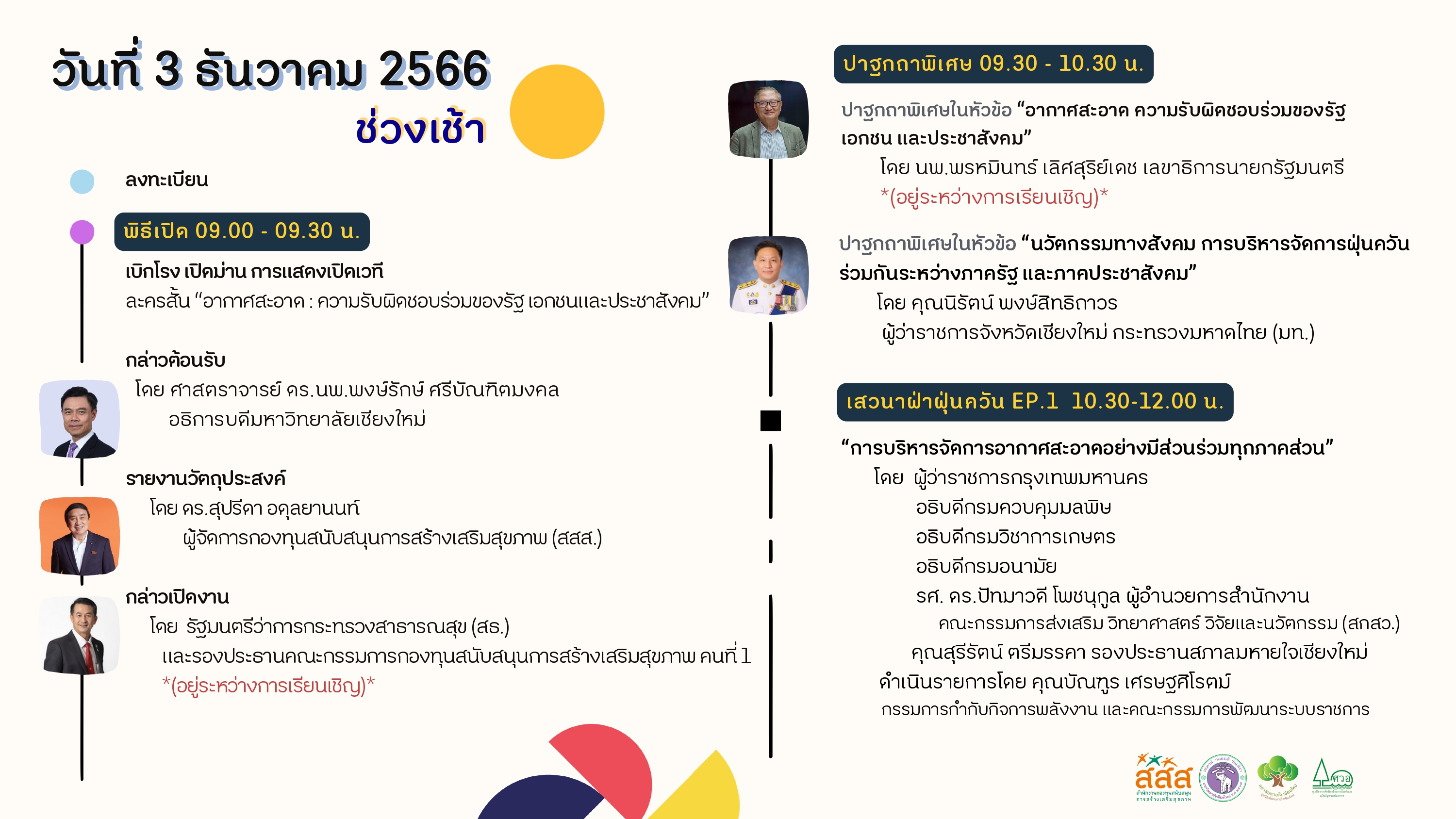 ทั้งนี้ การจัดประชุมระดับชาติประกอบด้วยการปาฐกถาพิเศษ การเสวนาฝ่าฝุ่นควัน การเสวนาย่อยในประเด็นนโยบายสาธารณะ การจัดเทศกาลเพื่อลมหายใจ การจัดนิทรรศการ การประชุมเชิงปฏิบัติการ กิจกรรมศิลปะดนตรี Talk และข้อเสนอเชิง นโยบายการแก้ปัญหามลพิษอากาศต่อรัฐบาล ซึ่งจากการประชุมดังกล่าวคาดว่า จะสามารถสร้างนโยบาย มาตรการ และแนวทางการแก้ไขปัญหาได้ในเชิงปฏิบัติและเชิงพื้นที่ และก่อให้เกิดสังคมที่ตระหนักรู้ถึงความสำคัญของปัญหาพิษทางอากาศผ่านการเผยแพร่สู่ สาธารณะชน นําไปสู่การจัดการและแก้ไขปัญหามลพิษทางอากาศ PM2.5 ในแต่ละพื้นที่อย่างเหมาะสมและเกิดความยั่งยืน