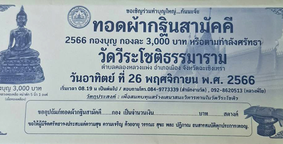 พระภาวนาประชานุกูล เจ้าคณะอำเภอบางน้ำเปี้ยว เจ้าอาวาสวัดวีระโชติธรรมาราม ต.คลองหลวงแพ่ง จ.ฉะเชิงเทรา เชิญชวนญาติโยม พุทธสาศนิกชนร่วมทำบุญทอดผ้าป่า สมทบโครงการทุนเล่าเรียนหลวงสำหรับพระสงฆ์ไทย โดยทางวัดวีระโชติธรรมารามจัดร่วมกับคณะสงฆ์หนตะวันออก เพื่อสืบสานหลักคำสอนในพระพุธศาสนา ณ.อุโบสถแก้ว กลางน้ำ ในวันอาทิตย์ที่ 12 พย 66 ที่จะถึงนี้ โดยจะมีองตมนตรี เดินทางมาเป็นผู้แทนพระองค์ เป็นประธานทอดผ้าป่า ในครั้งนี้