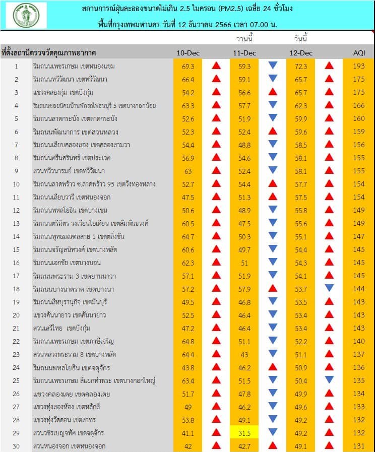 ด้านศูนย์ข้อมูลคุณภาพอากาศกรุงเทพมหานคร สรุปผลการตรวจวัดค่าฝุ่น PM2.5 เวลา 05.00-07.00 น. มีแนวโน้มเพิ่มขึ้นเมื่อเทียบกับเมื่อวานในช่วงเวลาเดียวกัน และพบว่าเกินมาตรฐานอยู่ในระดับสีส้ม หรือ เริ่มมีผลกระทบต่อสุขภาพ จำนวน จำนวน 66 พื้นที่ โดยพื้นที่ที่พบค่าฝุ่นPM2.5 เกินค่ามาตรฐานสูงสุด 10 อันดับแรก ประกอบด้วย
