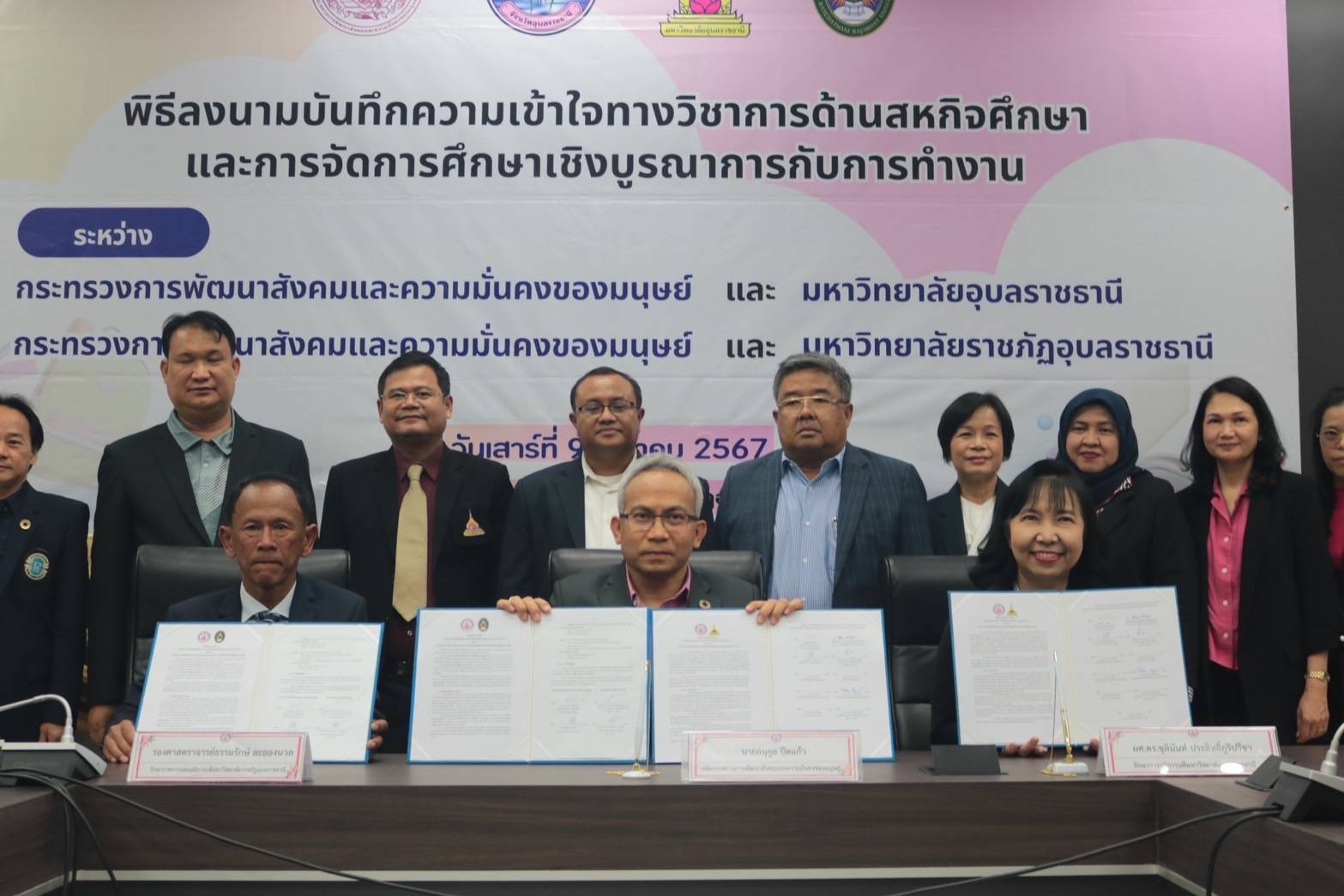 วันที่ 10 มี.ค. ที่ จ.อุบลราชธานี นายอนุกูล ปีดแก้ว ปลัดกระทรวงการพัฒนาสังคมและความมั่นคงของมนุษย์ (ปลัด พม.) เปิดเผยว่า ตนได้ลงนามในบันทึกความเข้าใจทางวิชาการด้านสหกิจศึกษาและการจัดการศึกษาเชิงบูรณาการกับการทำงาน ระหว่างกระทรวงการพัฒนาสังคมและความมั่นคงของมนุษย์ และมหาวิทยาลัยอุบลราชธานี (มอบ.) และระหว่าง กระทรวงการพัฒนาสังคมและความมั่นคงของมนุษย์ และมหาวิทยาลัยราชภัฏอุบลราชธานี (มรภ.อบ.) ร่วมกับ ผศ.ดร.ชุตินันท์ ประสิทธิ์ภูริปรีชา อธิการบดีมหาวิทยาลัยอุบลราชธานี และรศ.ธรรมรักษ์ ละอองนวล อธิการบดีมหาวิทยาลัยราชภัฏอุบลราชธานี ร่วมลงนาม เมื่อวันที่ 9 มี.ค.67 ที่ห้องประชุมปทุมวรราช ศาลากลางจังหวัดอุบลราชธานี อำเภอเมือง จังหวัดอุบลราชธานี