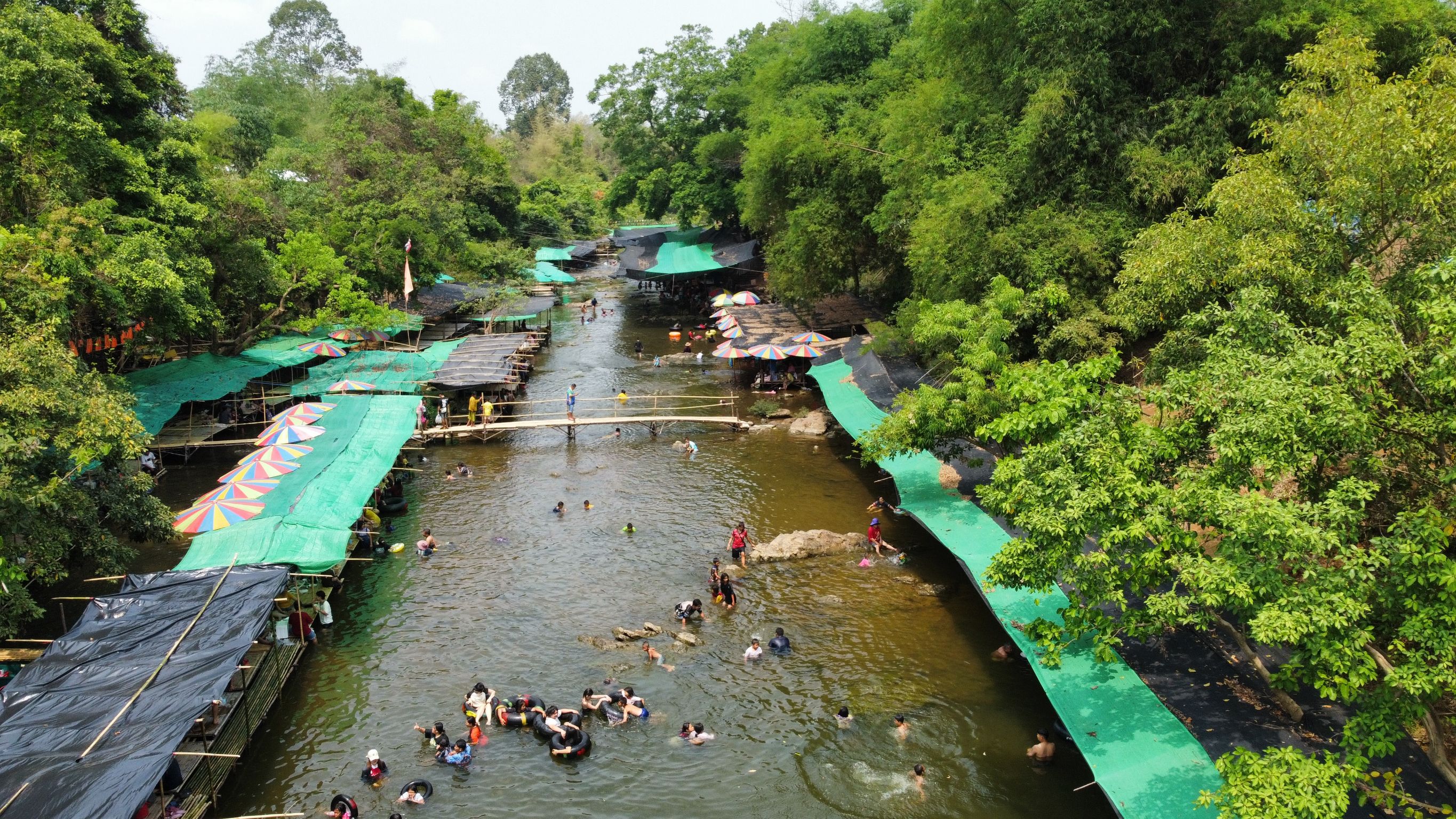 และมีร้านอาหารมากมาย หลายอย่าง รวมถึงร้านขายเสื้อผ้า ห่วงยาง และยังมีเสื้อชูชีพไว้คอยให้ลูกค้าไว้สวมใส่ เพื่อป้องกันอันตราย ส่วนด้านล่างก็จะเป็นพื้นที่ ที่นั่นกินอาหารหรือเท้าแช่น้ำ มีลักษณะเป็นแคร่ หรือซุ้ม ให้บริการ ราคา จะอยู่ ที่100 บาท สามารถนั่งได้ทั้งวัน ซึ่งตั้งอยู่ริมน้ำทั้งสองฝั่งสองข้าง ลำธาร และยังมีร่มหลายสีไว้บังแดดให้กับนักท่องเที่ยวบรรเทาความร้อนก่อนแช่น้ำ ถ้ามองจากด้านบน ลงไปด้านล่าง ก็จะเป็นอะไรที่สวยงาม มากๆ เลย