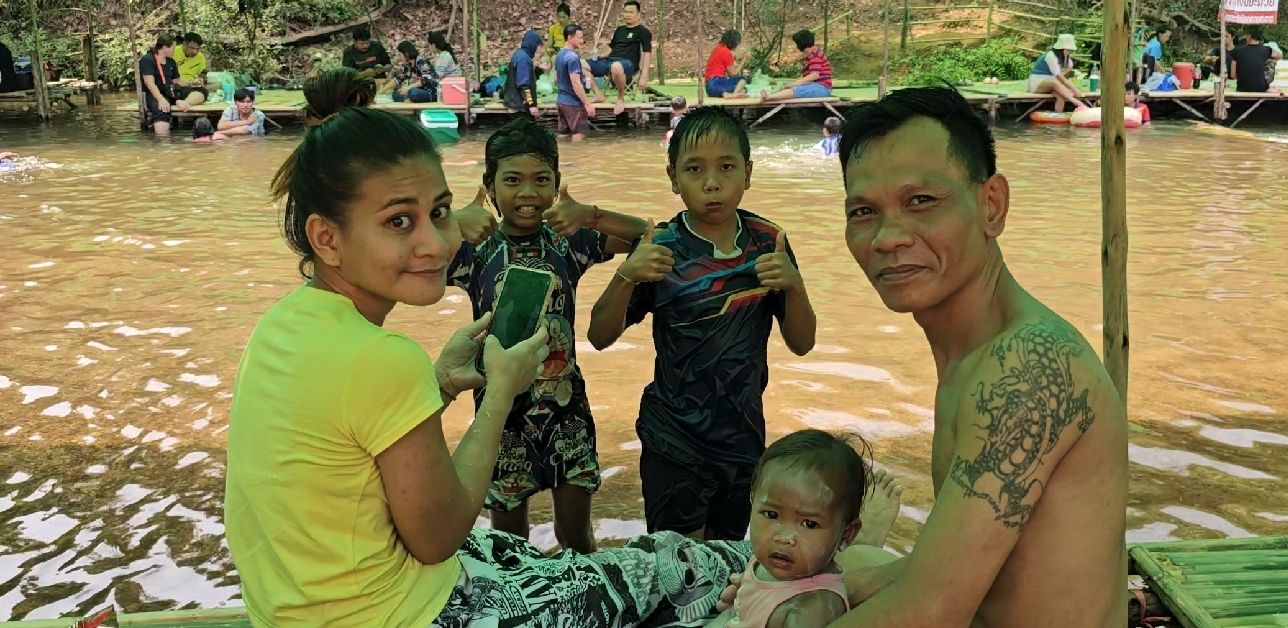 ด้านคุณฤดี ก็เป็นอีกหนึ่งคน เล่าให้ผู้สื่อข่าวฟังว่า ตนเองคอยดูแล แพนั่ง ของวัด ซึ่งจะนำรายได้ถวายวัดทั้งหมด ราคาแพนั่งเก็บอยู่ที่ 100 บาท ต่อวัน สามารถนั่งได้ทั้งครอบครัว และก็อยากเชิญชวนนักท่องเที่ยวให้มาเที่ยวกันเยอะๆ เปิดให้บริการตั้งแต่ 7:00 น จนถึง 18:00 น ของทุกวัน" คุณเอ ก็เป็นอีกหนึ่งครอบครัว ที่เดินทางมาจากชายแดนคลองหาด จังหวัดสระแก้ว ในวันหยุดวันนี้บอกว่าอากาศร้อนมากเลยพาครอบครัวมาคลายร้อน ที่ธารน้ำไหลบ้านนา อำเภอ เขาฉกรรจ์จังหวัดสระแก้วเช่นกัน...