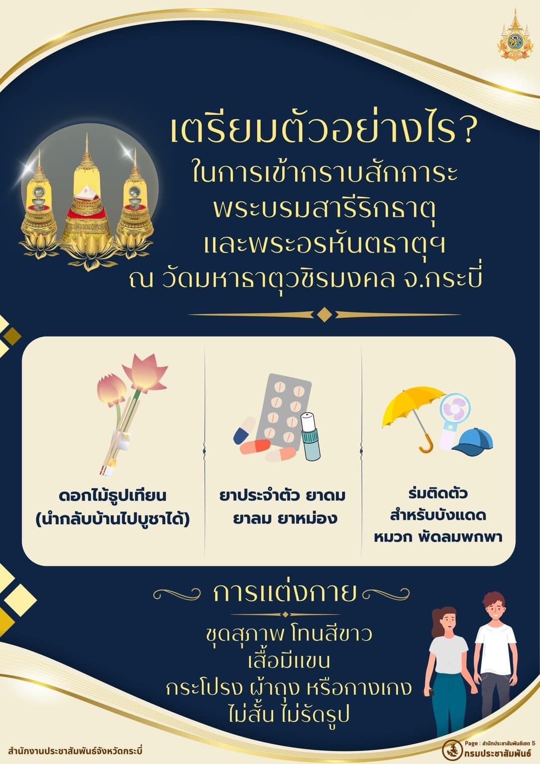 “ชาวกระบี่ พร้อมรับการอัญเชิญพระบรมสารีริกธาตุและพระอรหันตธาตุฯ จากสาธารณรัฐอินเดีย มาประดิษฐานชั่วคราว ณ วัดมหาธาตุวชิรมงคล (วัดบางโทง)” เชิญชวนพุทธศาสนิกชนร่วมกราบสักการะ