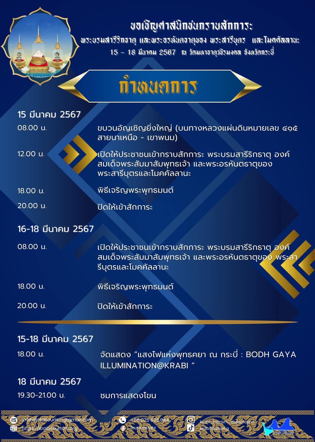 รัฐมนตรีว่าการกระทรวงวัฒนธรรม (รมว.วธ.) กล่าวเพิ่มเติมว่า ในส่วนจังหวัดกระบี่ ได้เตรียมจัดพิธีอัญเชิญพระบรมสารีริกธาตุและพระอรหันตธาตุ ของพระสารีบุตรและพระโมคคัลลานะ จากพิพิธภัณฑสถานแห่งชาติอินเดีย มาประดิษฐานเป็นการชั่วคราว ณ วัดมหาธาตุวชิรมงคล (วัดบางโทง) ระหว่างวันที่ 15 - 18 มีนาคม 2567 โดยในวันที่ 14 มีนาคม 2567 เวลา 07.00 น.