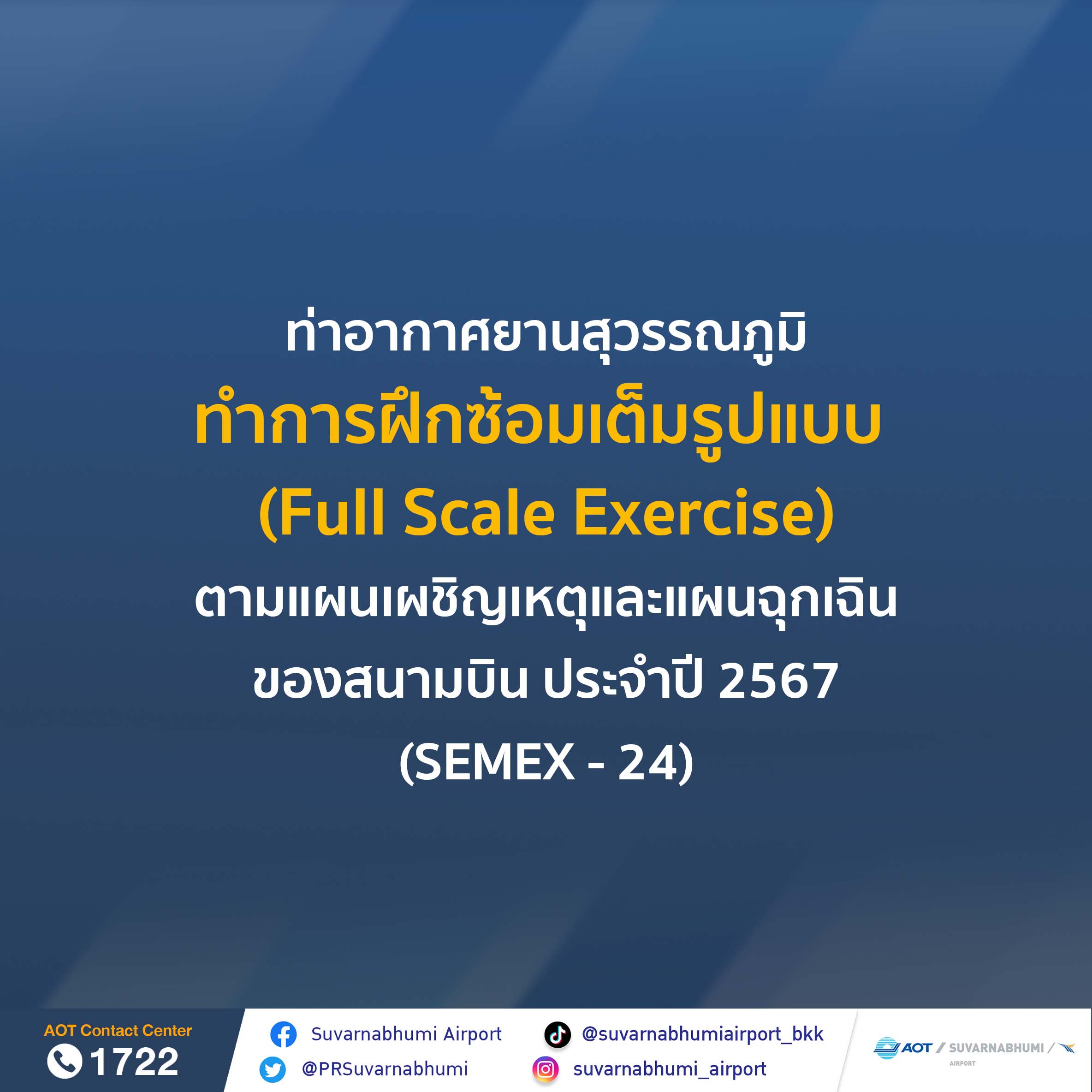 ท่าอากาศยานสุวรรณภูมิทำการฝึกซ้อมเต็มรูปแบบ (Full Scale Exercise) ตามแผนเผชิญเหตุและแผนฉุกเฉินของสนามบินประจำปี 2567 (SEMEX - 24)