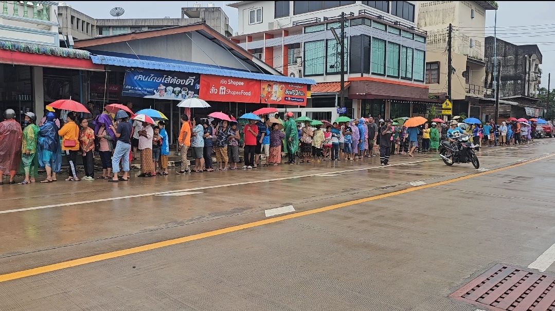 วันที่ 12 สิงหาคม 2567 เวลา 10.00น. ที่บ้านเลขที่ 100 ถ.ชลประทาน ต.วังกระแจะ อ.เมือง จ.ตราด ประชาชนชาวตราดแห่เข้าแถวยืนรอรับข้าวสาร ท่ามกลางสายฝน หลังจาก นางกิม กี่ สุขสวัสดิ์ นายนาวี สุขสวัสดิ์ นางเบญญาภา เพ็ชรรัตน์ พร้อมครอบครัว ร่วมกันทำดีถวายแม่หลวง ของแผ่นดิน เพื่อถวายเป็นพระราช กุศลฯ เนื่องในโอกาสมหามงคลเฉลิมพระชนมพรรษา 12 สิงหาคม 2567 สมเด็จพระนางเจ้าสิริกิติ์ พระบรมราชินีนาถ พระบรมราชชนนีพันปีหลวง เพื่อเฉลิมพระเกียรติ แสดงความจงรักภักดีและสำนึกในพระมหากรุณาธิคุณ ของพระองค์ท่าน ด้วยการแจกข้าวสารจำนวน 500 ถุง 2,500 กิโล ให้แก่พี่น้องชาวตราด เป็นข้าวสาร จำนวน 500 ถุง ถุงละ 5 กก.