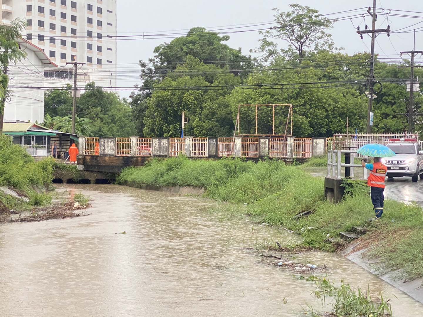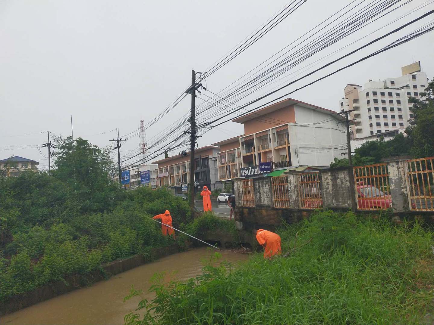 มุกดาหารน้ำท่วม เทศบาลนำเจ้าหน้าที่ พร้อมเครื่องสูบน้ำ เก็บเศษสิ่งของอุดตันทางน้ำ