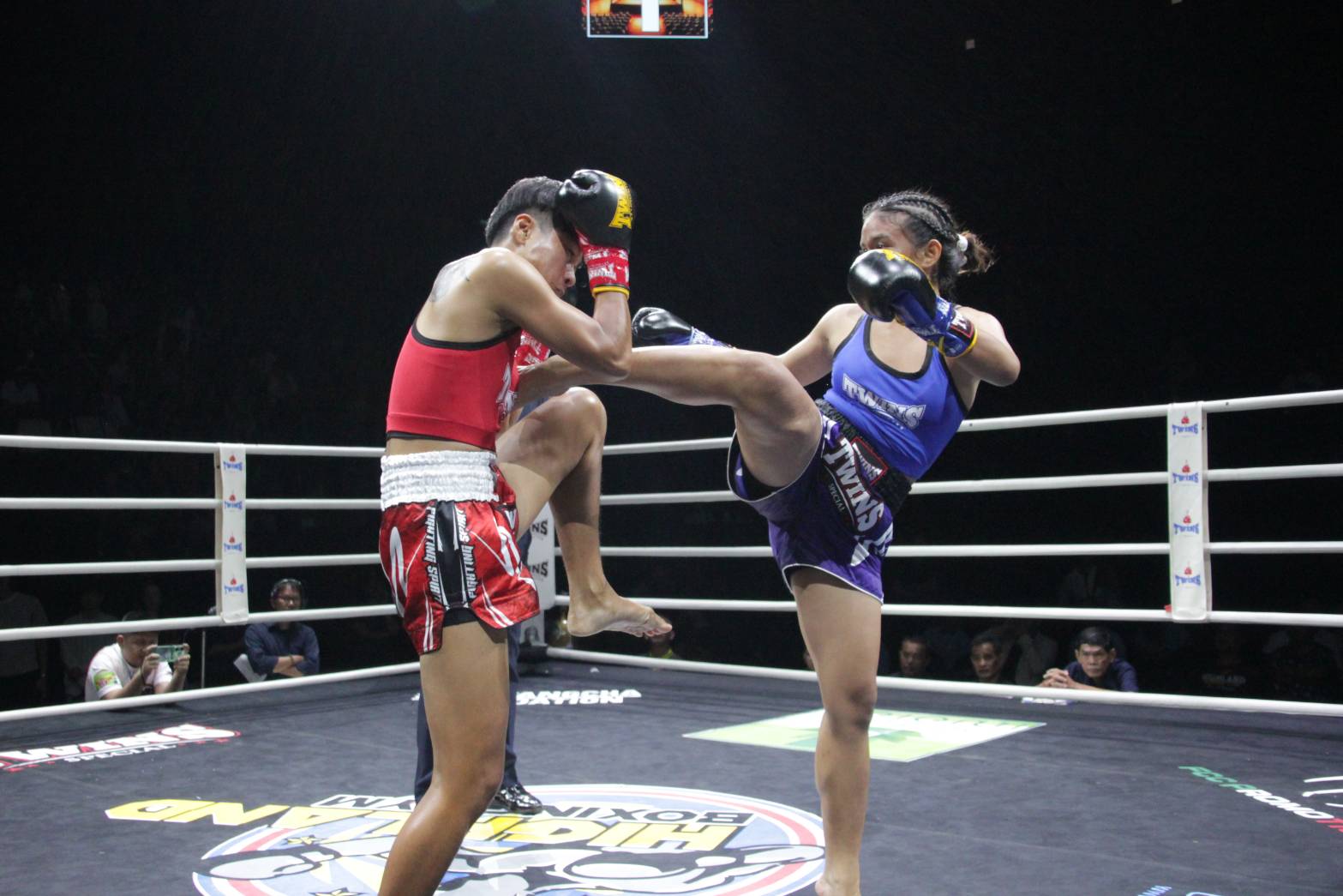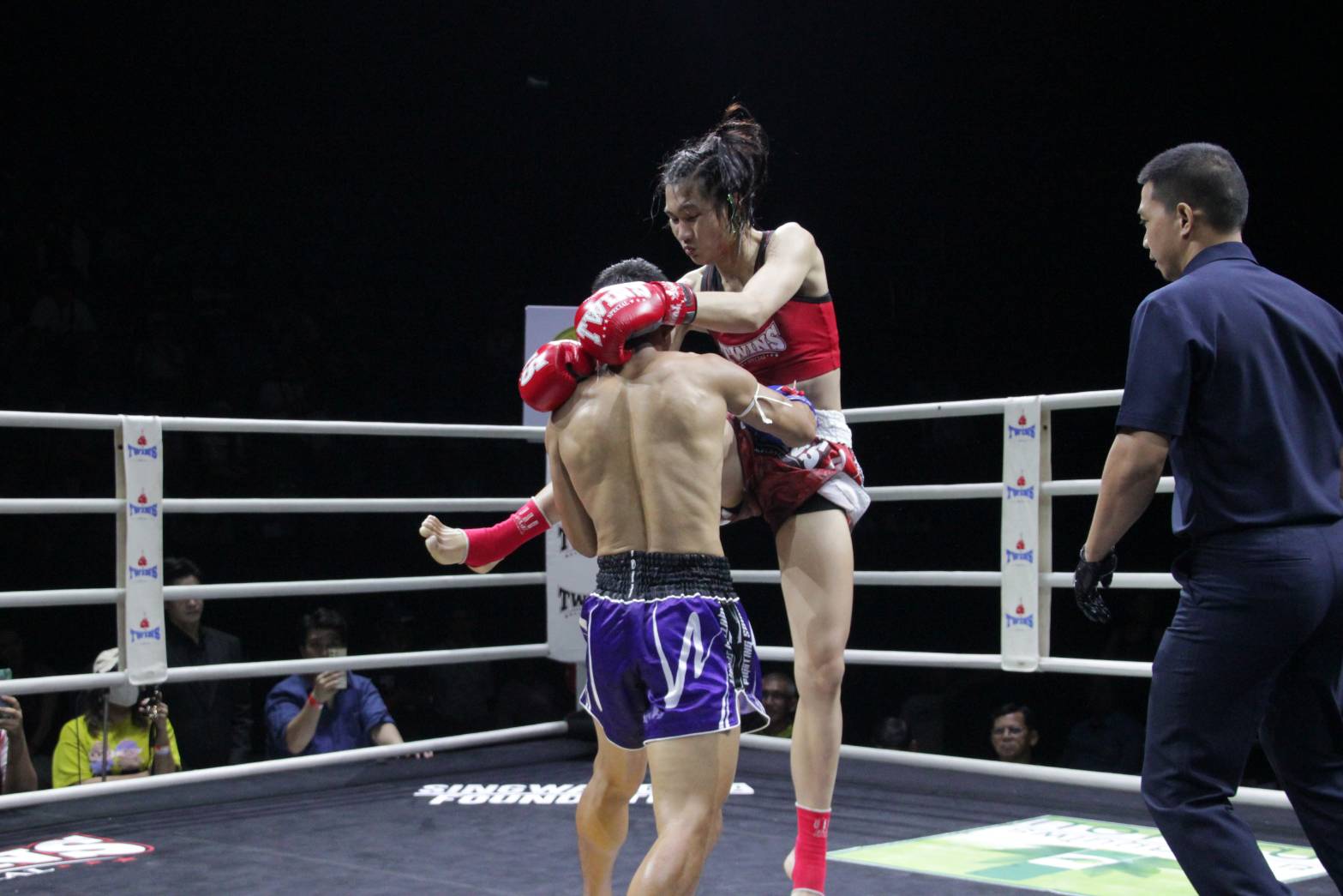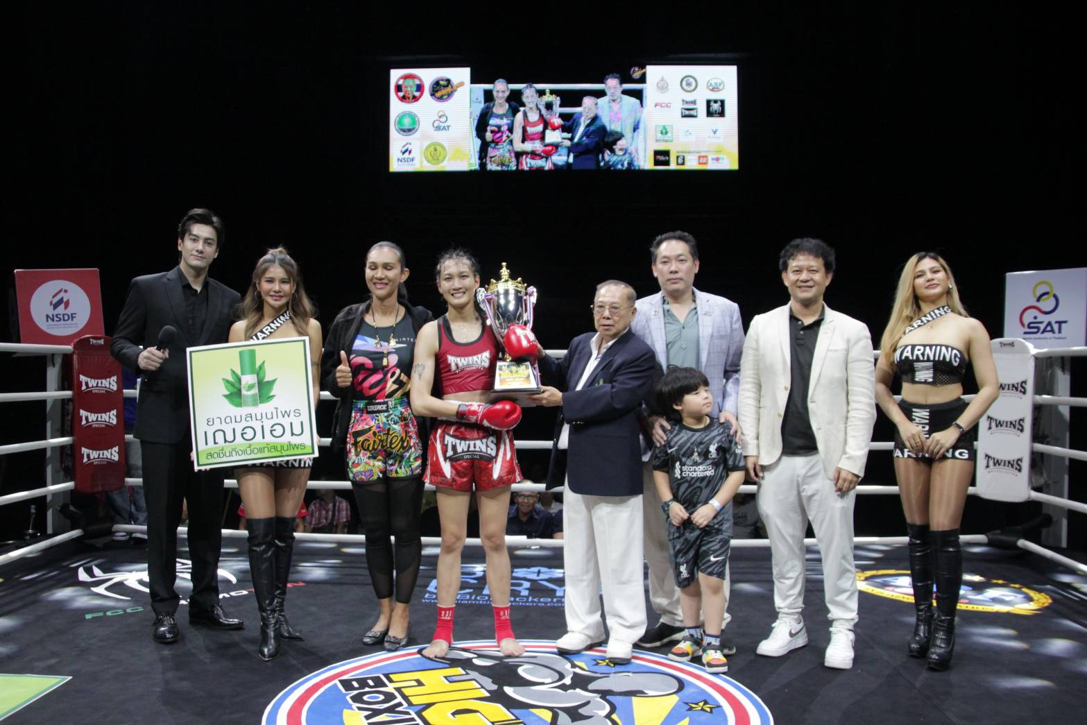 คู่ที่ 6. มวยไทยหญิง 3 ยก รุ่นพินไฟท์ 100 ปอนด์ เพชรสายฟ้า ไฮแลนด์ยิม โดนพายุเข่าแพ้น็อคยก 3 ให้กับเพชรหนูนา ส.วารุณีมวยไทย