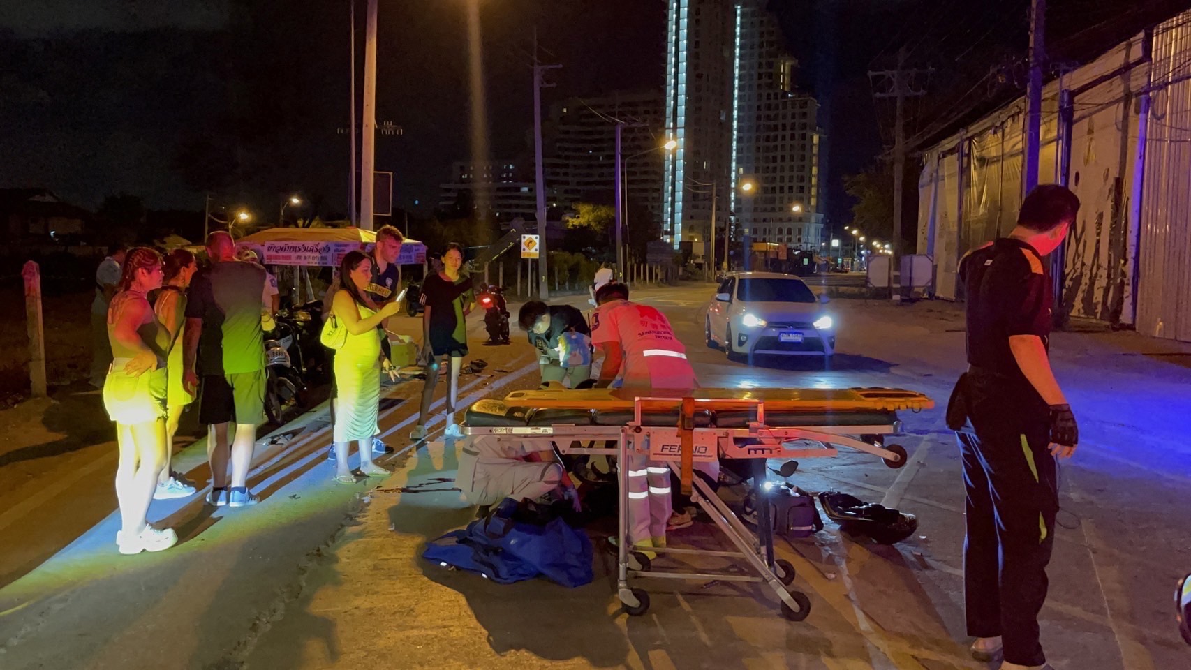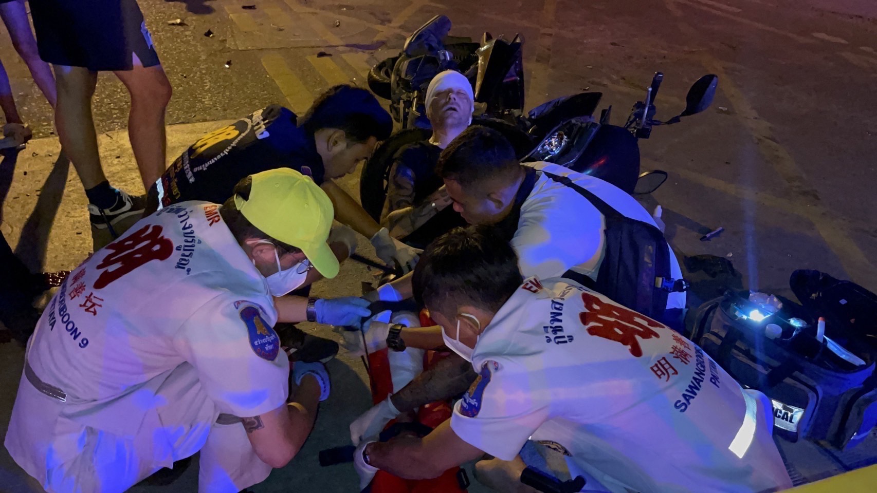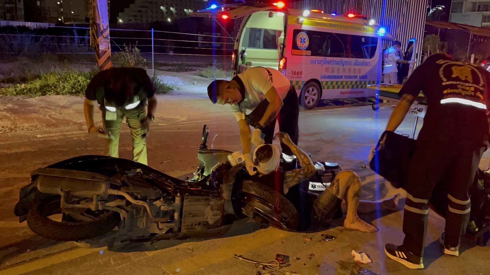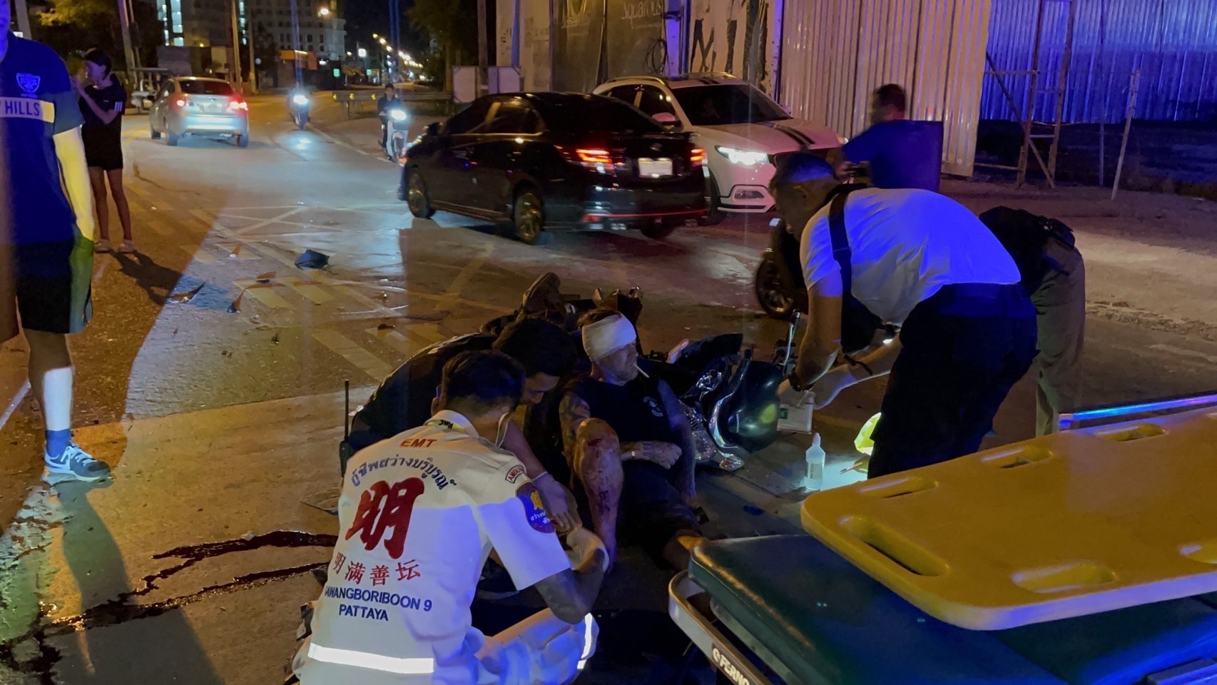 ที่เกิดเหตุกลางถนน พบรถจักรยานยนต์ ฮอนด้า พีซีเอ็กซ์ สีเทา ทะเบียน 2 กบ 5630 ชลบุรี สภาพรถพังยับเยิน กลางถนนยังพบร่างผู้บาดเจ็บเป็นชายชาวต่างชาติ ไม่ทราบสัญชาติที่แท้จริง ได้รับบาดเจ็บสาหัส มีบาดแผลฉีกขาด ที่ศีรษะขนาดใหญ่ เจ้าหน้าที่กู้ภัยฯ และทีมแพทย์ช่วยเหลือปฐมพยาบาลเบื้องต้น ก่อนเคลื่อนย้ายนำตัวส่งโรงพยาบาลอย่างเร่งด่วน