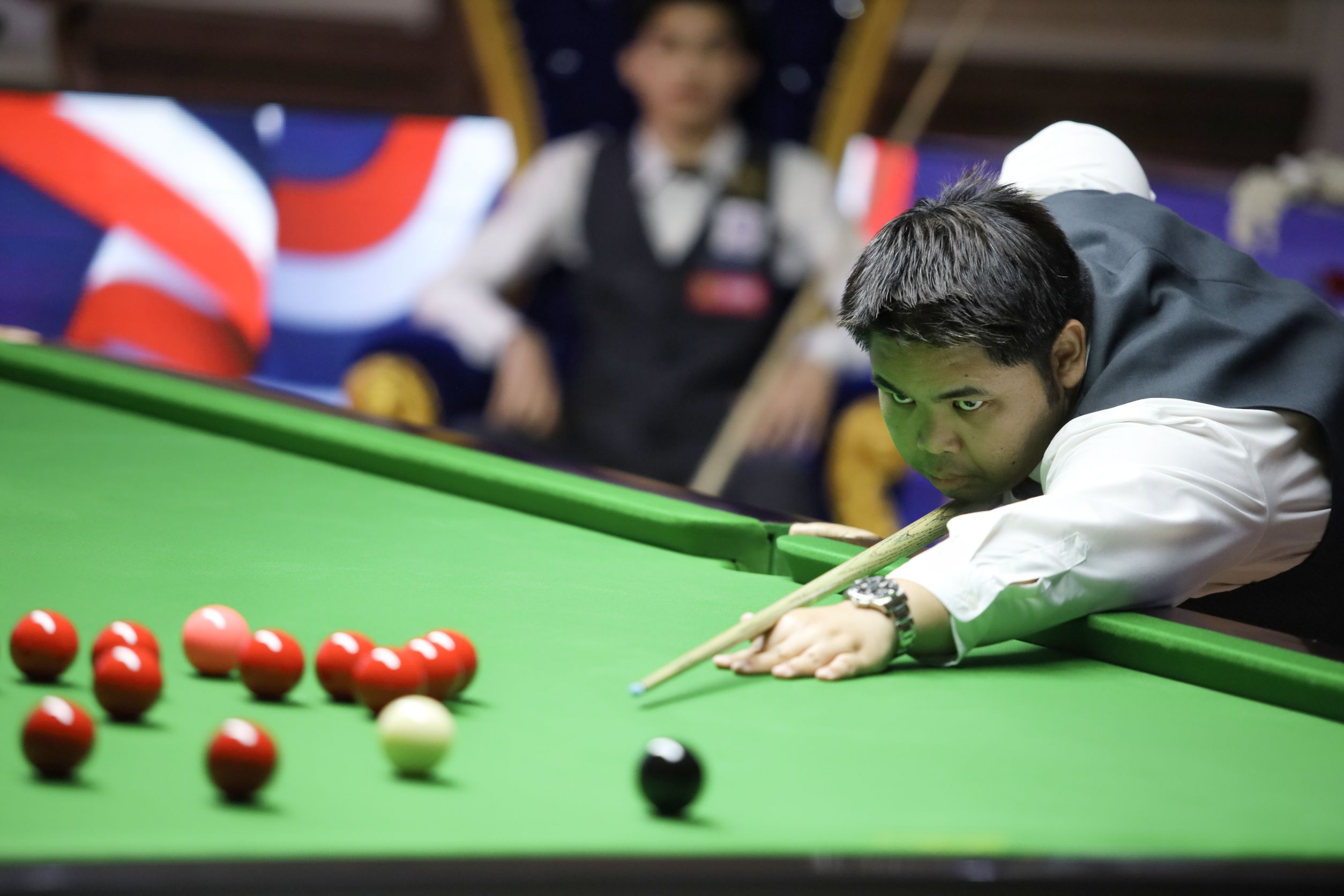 โดยเกมคู่นี้ ช่วงแรก กอล์ฟ ออกมาแทงได้แม่นยำ และครบเครื่องกว่า ขณะที่ เต็ก หัวหิน มีโอกาสตบสู้หลายไม้ แต่ผิดพลาดง่ายเอง ทำให้ 2 เฟรม กอล์ฟ ตบชนะนำก่อน 2-0 เฟรม แต่เฟรมสาม กอล์ฟ แทงดีแค่ช่วงต้นเฟรม มาโดน เต็ก ไล่ตบแดงทีละชุดจนสามารถเอาชนะไปสบาย 70-34 ไล่มา 1-2 เฟรม แต่สุดท้ายแล้ว จอมคิวเจ้าถิ่น แทงเสียงเอง ส่งให้ กอล์ฟ บางพระ ไล่ทิ่มปิดเกม เอาชนะไป 4-1 เฟรม 59-24, 62-21, 34-70, 51-24, 94-0 ผ่านเข้าสู่รอบ 16 คนสุดท้าย ไปเจอ "ไผ่ สากล"จงรักษ์ บุญรอด