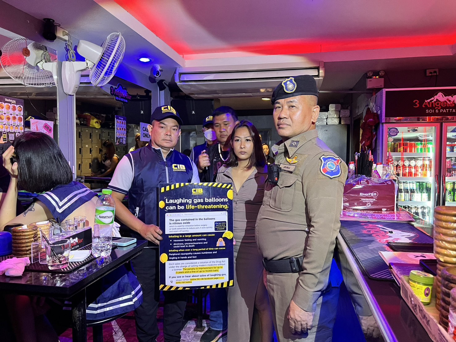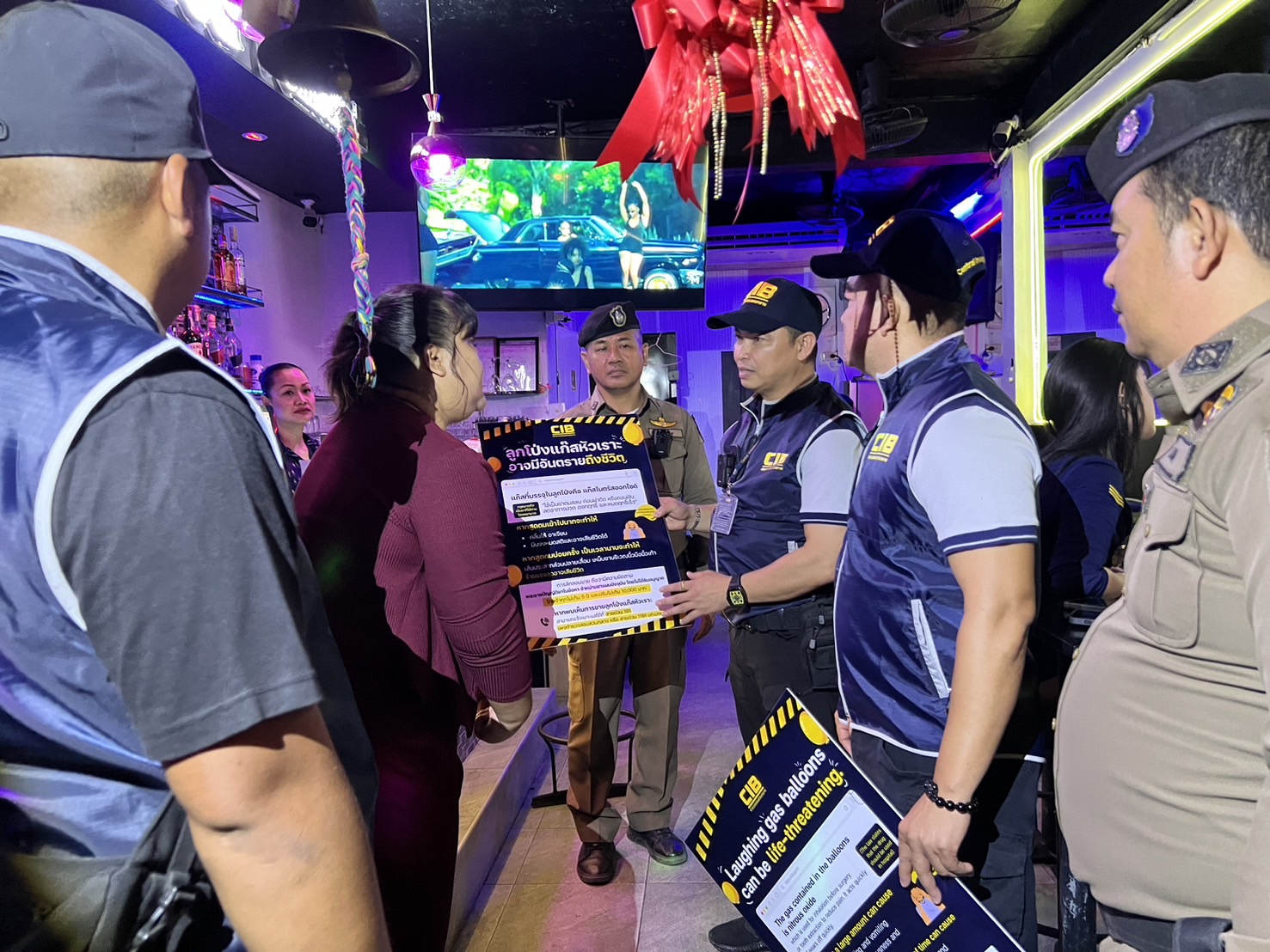 โดยกำลังเจ้าหน้าที่กว่า 20 นาย เดินเท้าตรวจสอบสถานบันเทิงกลุ่มผับบาร์เบียร์ เน้นร้านที่มีการตกแต่งด้วยลูกโป่งที่ โดยใช้ป้ายทั้งภาษาไทยและภาษาอังกฤษ ประชาสัมพันธ์ชี้แจง ให้ผู้ประกอบการห้ามลักลอบจำหน่ายลูกโป่งที่บรรจุแก๊สไนรตรัสออกไซด์ ให้นักท่องเที่ยวใช้สูดดมเด็ดขาด