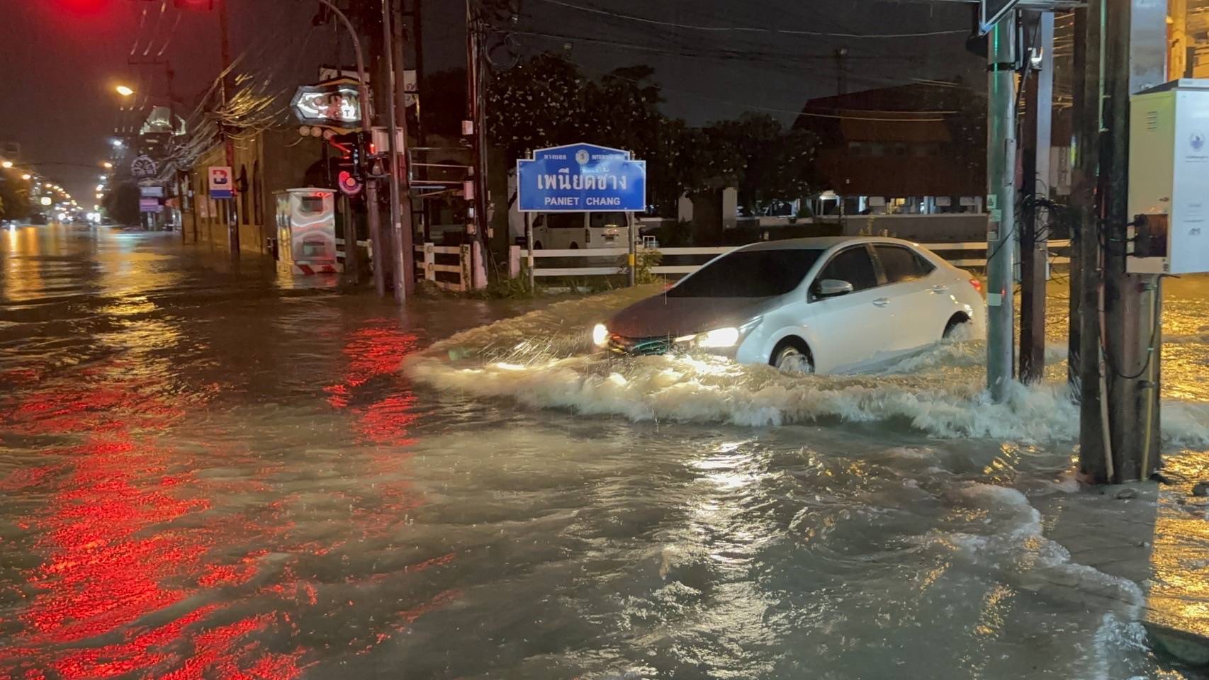 จากมวลน้ำที่เอ่อทะลักจนท่วมขังบนถนนสายหลัก ส่งผลให้รถจักรยานยนต์รวมถึงรถยนต์ขนาดเล็กไม่สามารถสัญจรผ่านไปได้ ซึ่งมีรถยนต์และรถจักรยานยนต์ที่ฝืน ฝ่ากระแสน้ำจนถูกกระแสน้ำพัดจมได้รับความเสียหายนับสิบคัน โชคดีที่ไม่มีรายงานผู้ได้รับบาดเจ็บ โดยเจ้าหน้าที่รับพลเมืองดีช่วยกันเข็น รถออกจากจุดท่วมขังเข้าไว้ข้างทาง