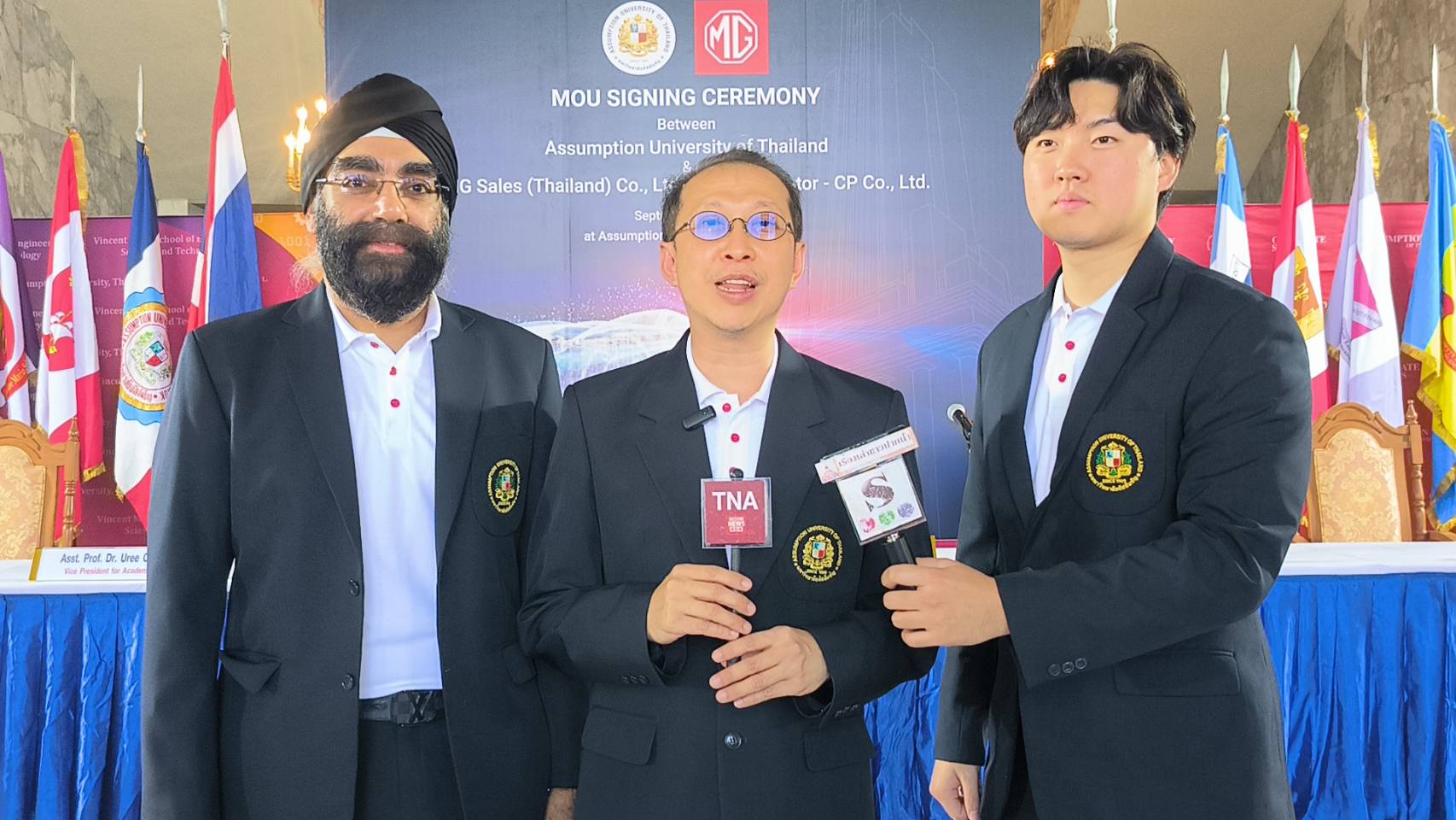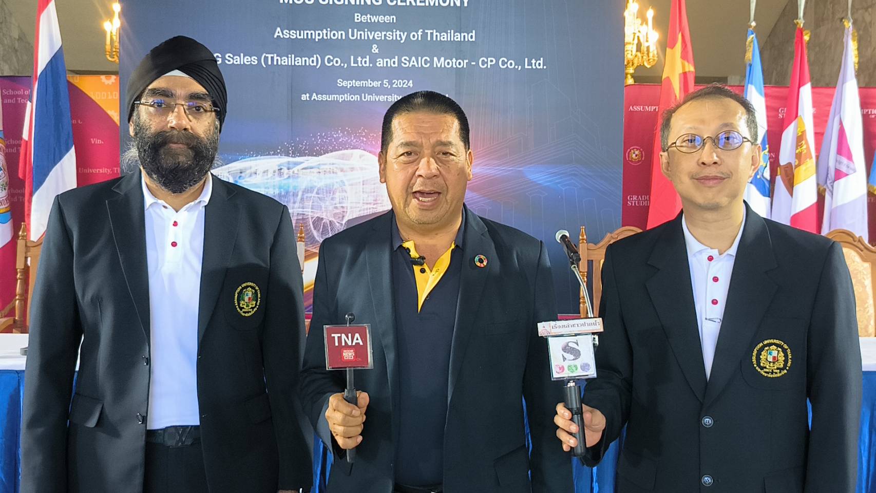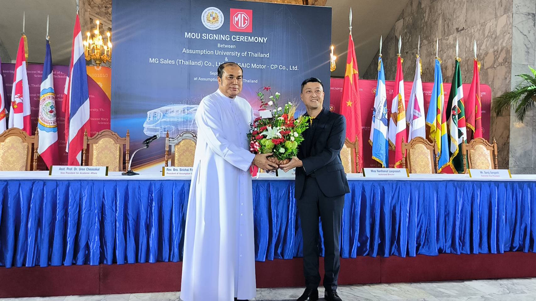 เมื่อเวลา 14:30 น.วันที่ 5 กันยายน 2567 ที่มหาวิทยาลัยอัสสัมชัญวิทยาเขตสุวรรณภูมิ อำเภอบางเสาธง จังหวัดสมุทรปราการ มหาวิทยาลัยอัสสัมชัญวิทยาเขตสุวรรณภูมิ นำโดยภราดา ดร. ศิริชัย ฟอนซีกา อธิการบดีมหาวิทยาลัยอัสสัมชัญ และ มร. ซู๋ว์ หยิ่น กรรมการผู้จัดการ บริษัท เอ็มจี เซลส์ (ประเทศไทย) จำกัด และ คุณสุโรจน์ แสงสนิท รองประธานกรรมการบริหารบริษัท เอสเอไอซี มอเตอร์ – ซีพี จำกัด, พร้อมด้วย คุณนันทนัช หลาวประเสริฐ, กรรมการ บริษัท เอ็มจี เซลส์ (ประเทศไทย) จำกัด ร่วมลงนามบันทึกข้อตกลง (MOU)ว่าด้วยการลงนามสัญญากับบริษัทและมหาวิทยาลัยอัสสัมชัญวิทยาเขตสุวรรณภูมิ ในการศึกษาด้านยานยนต์พลังงานทางเลือกและนวัตกรรม