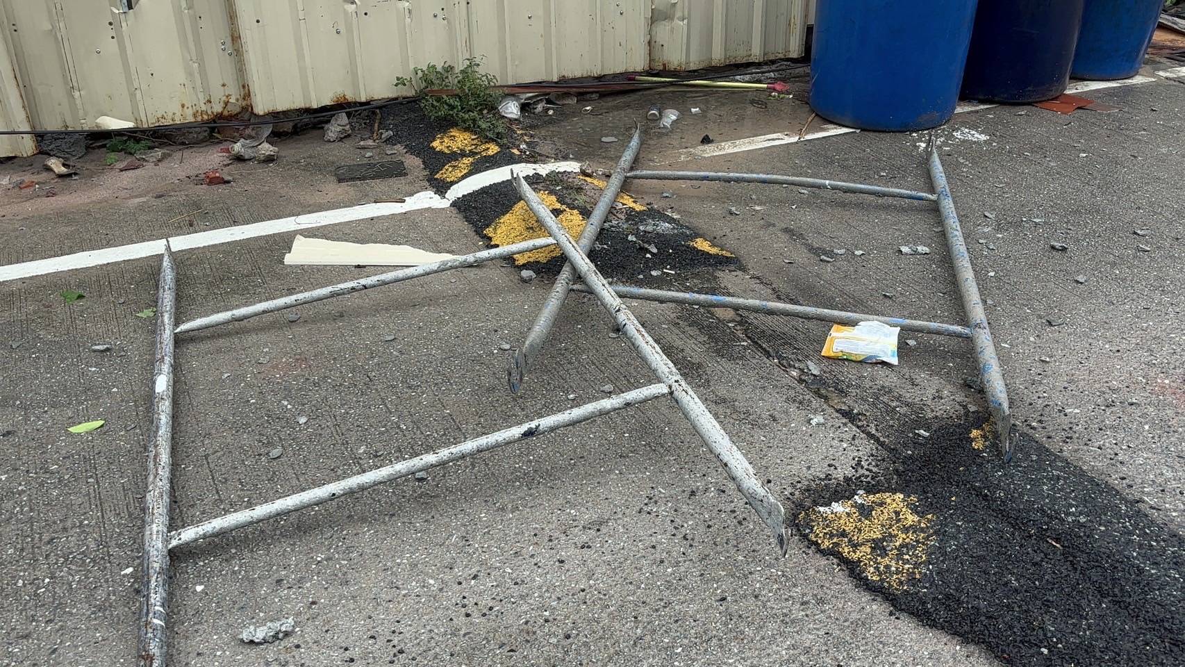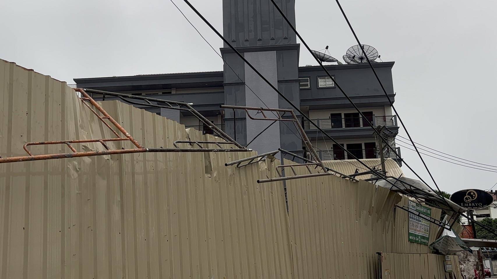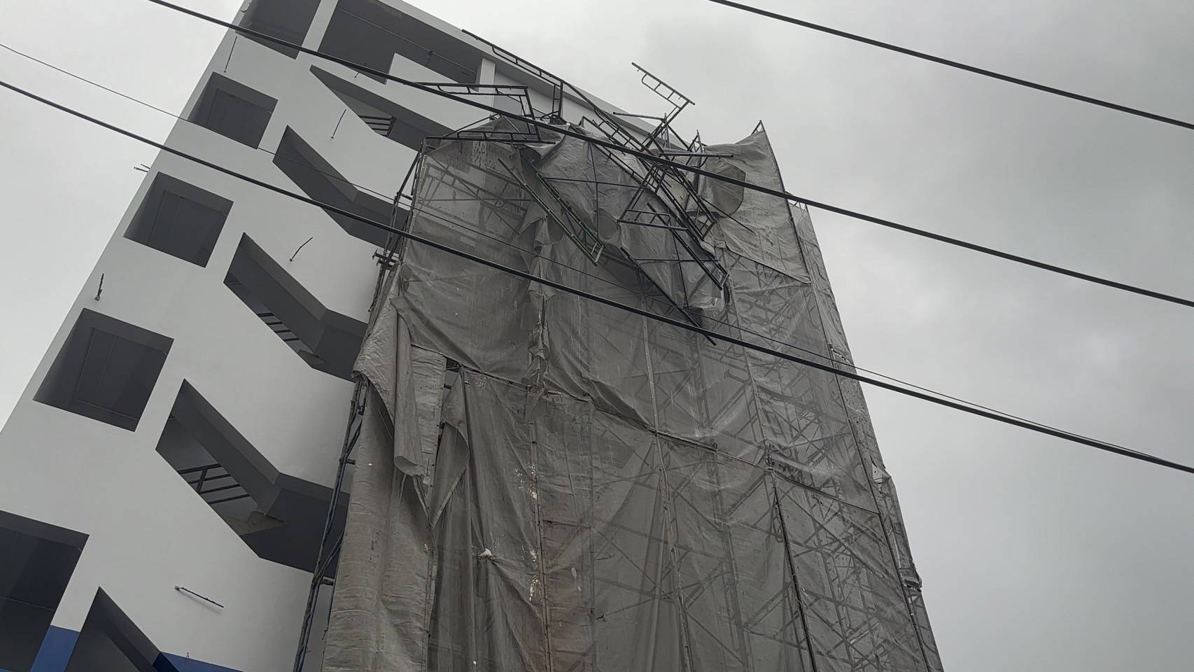บริเวณที่เกิดเหตุเป็นไซด์งานก่อสร้างโรงแรมความสูง 7 ชั้น รอบตัวอาคารจะมีนั่งร้านติดตั้งไว้สำหรับงานก่อสร้าง มีสแลมกั้นไว้ ตรวจสอบที่ด้านหน้าตึก พบนั่งร้านถูกแรงลมพัดตกห้อยระโยงระยาง และยังพบแผ่นเหล็กตัวนั่งร้านถล่มตกลงมากลางถนน โดยนั่งร้านยังตกลงมาทับสายไฟบนเสาไฟฟ้าแรงสูง จนหักโค่นพลาดขวางถนน โชคดีไม่มีรายงานผู้ได้รับบาดเจ็บแต่อย่างใด