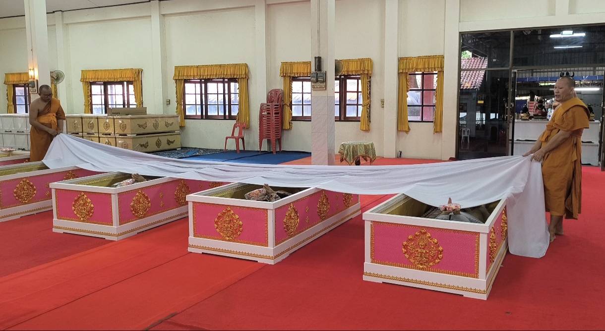 นครนายก - นักท่องเที่ยวเดินทางมาวัดหลวงพ่อปากแดงเข้าพิธีนอนโลงศพสะเดาะเคราะห์ต่อดวงชะตา ฝึกตายก่อนตายจริงฝึกสติให้คิดได้ว่าทุกคนหนีไม่พ้นความตายพร้อมเจิมกระเป๋าลงยันต์