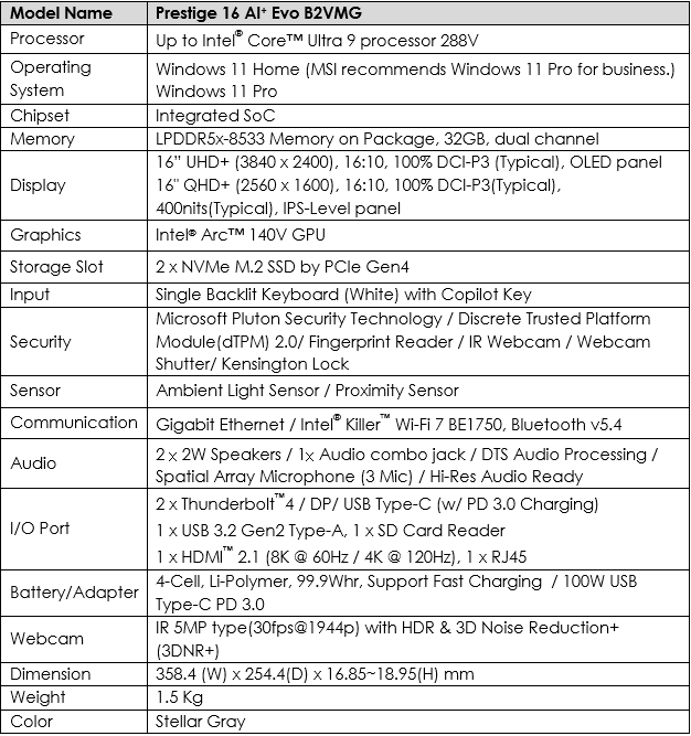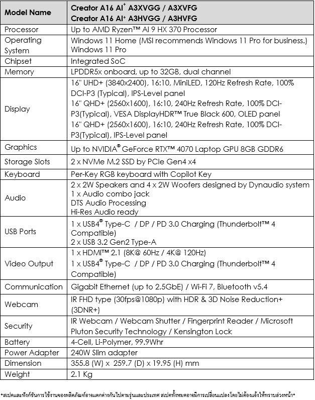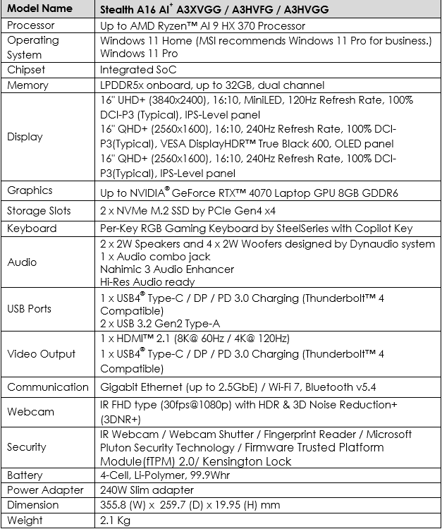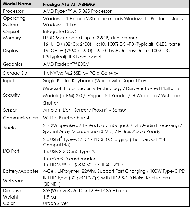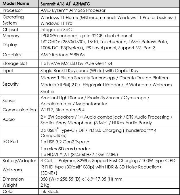 ในทางกลับกัน Summit A16 AI+ และ Prestige A16 AI+ จะถูกนำเสนอในรูปแบบหน่วยประมวลผล AMD Ryzen™ AI 300 Series พร้อมกับซอฟต์แวร์ AI เอกสิทธิ์เฉพาะของ MSI เช่น MSI AI Engine และ MSI AI Noise Cancellation Pro การออกแบบโน้ตบุ๊กที่ปรับแต่งให้เหมาะสมและซอฟต์แวร์ที่ขับเคลื่อนด้วย AI ทำให้ Summit A16 AI+ และ Prestige A16 AI+ เป็นโน้ตบุ๊กที่เหมาะสำหรับการทำงานในสภาพแวดล้อมยุคสมัยใหม่