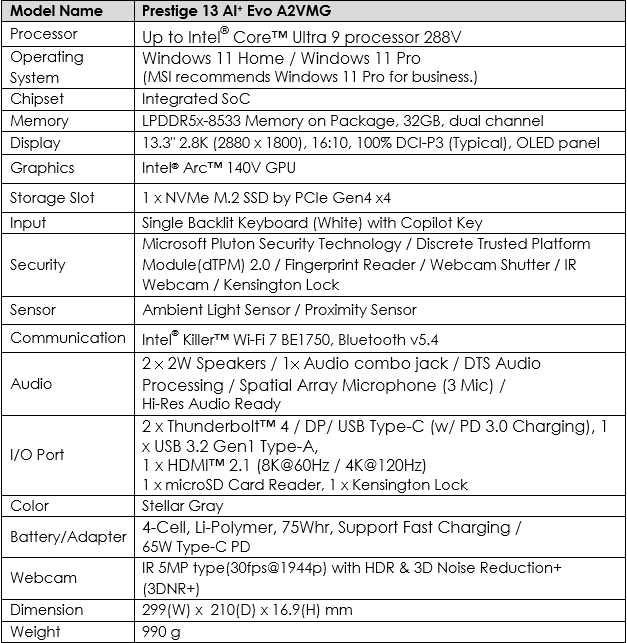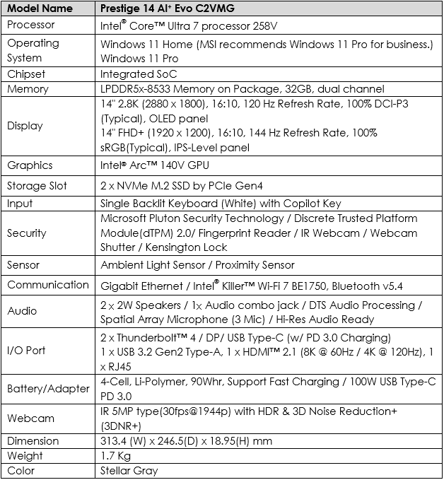 โน้ตบุ๊กซีรีส์ Prestige มาพร้อมกับขนาดหน้าจอสามขนาด ได้แก่ 13, 14 และ 16 นิ้ว นอกเหนือจากการใช้หน่วยประมวลผลรุ่นล่าสุดแล้ว โน้ตบุ๊กในซีรีส์ Prestige ยังมีตัวเครื่องที่บางเบา แบตเตอรี่ขนาดใหญ่ และอายุการใช้งานแบตเตอรี่ที่ยาวนานอีกด้วย ตัวอย่างเช่น เมื่อเทียบกับซีรีส์ Prestige รุ่นก่อน ซีรีส์ Prestige ทั้งหมดได้อัปเกรดอายุการใช้งานแบตเตอรี่ให้ยาวนานขึ้น โดยทุกขนาดสามารถใช้งานได้สูงสุดถึง 20 ชั่วโมงในการเล่นวิดีโอและการทำงาน นอกจากนี้ยังได้อัปเกรดเป็นเว็บแคมความละเอียด 5 ล้านพิกเซล ซึ่งมอบคุณภาพสูงในการสตรีมมิ่งและการประชุมออนไลน์