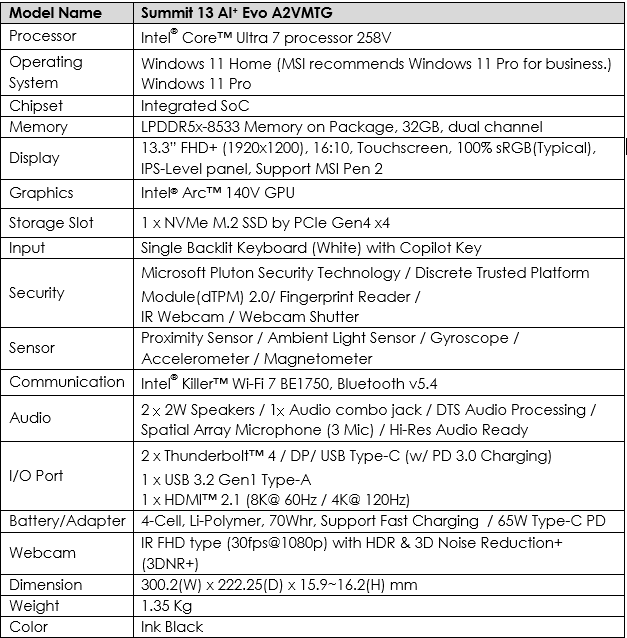 ในส่วนของ Summit 13 AI+ Evo ซึ่งเป็นส่วนหนึ่งของ Business and Productivity Series ได้รับการติดตั้งหน่วยประมวลผล Intel® Core™ Ultra (Series 2) รุ่นใหม่ ตัวเครื่องที่เบาบาง ความปลอดภัยที่ครอบคลุม และสไตลัส MSI Pen 2 ที่รองรับ MPP 2.6 ทำให้มันกลายเป็นโน้ตบุ๊ก 2-in1 จอขนาด 13 นิ้วที่มีความหลากหลายมากที่สุด