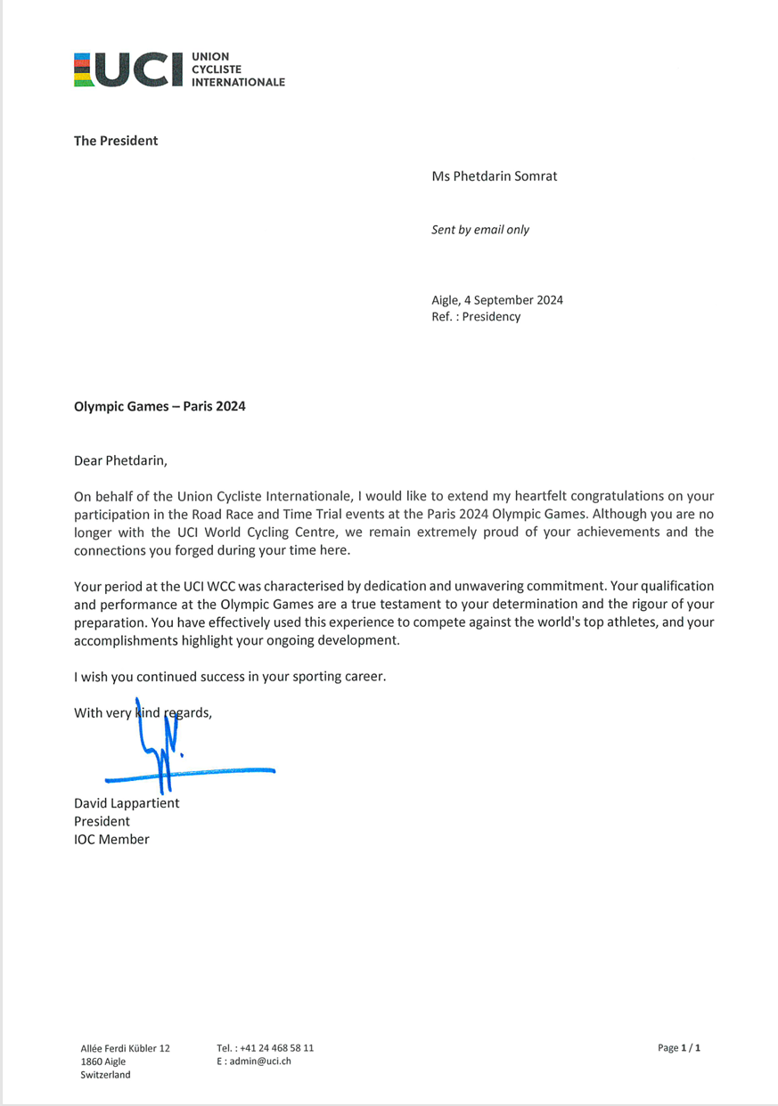 ขอให้คุณประสบความสำเร็จอย่างต่อเนื่องในอาชีพนักกีฬาของคุณ ขอแสดงความนับถือ” ลงชื่อ เดวิด แลปปาร์เตียน ประธานยูซีไอ และไอโอซี เมมเบอร์