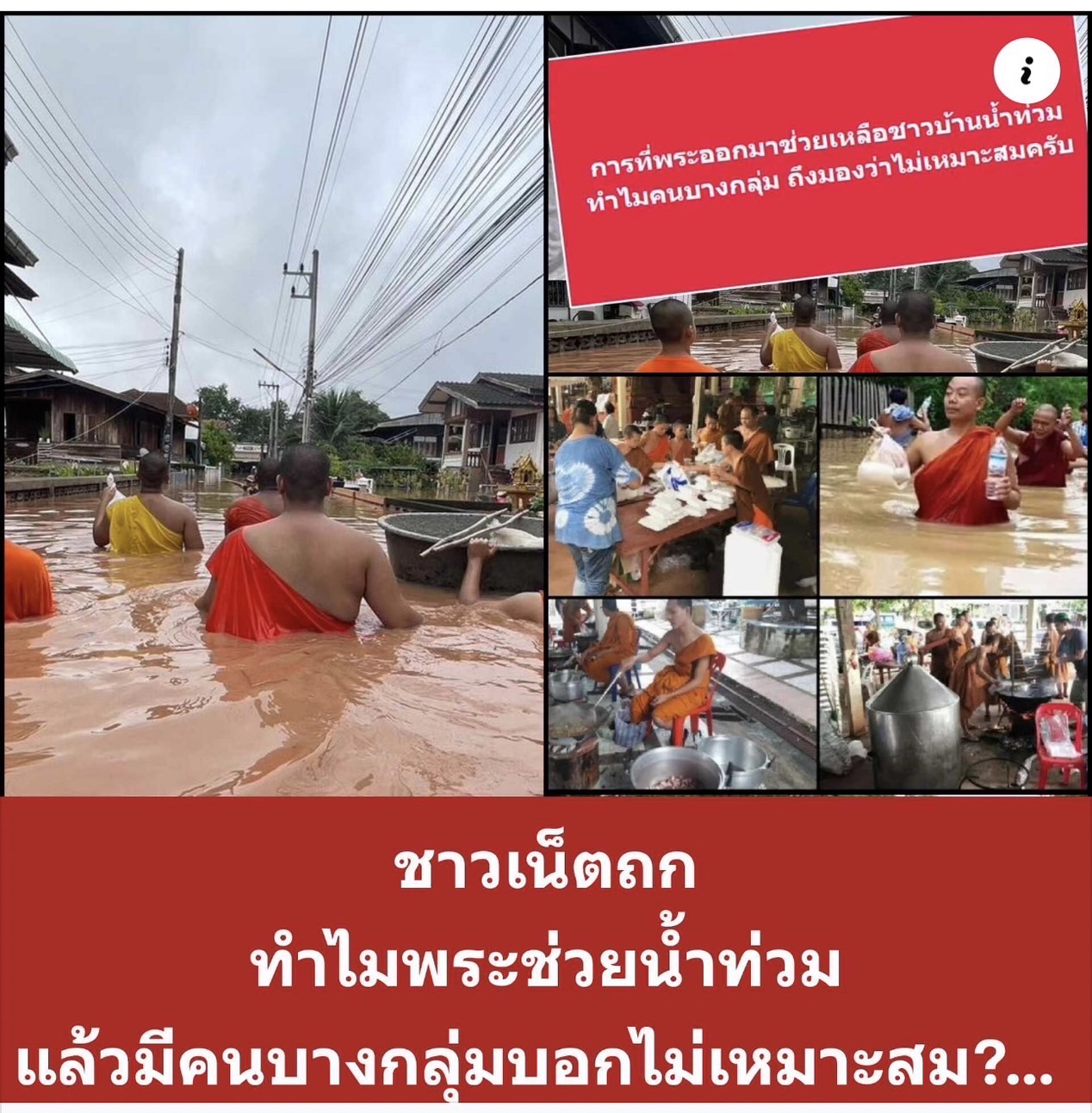จากกรณีชาวเน็ตกำลังถกเถียงกันอย่างหนักในประเด็นที่พระสงฆ์ออกมาช่วยเหลือผู้ประสบภัยน้ำท่วม โดยมีความคิดเห็นแตกออกเป็นสองฝ่าย หลังเกิดเหตุอุทกภัยครั้งใหญ่ในหลายจังหวัดภาคเหนือ รวมถึงจังหวัดน่าน พระสงฆ์หลายรูปได้ลุยน้ำท่วมเพื่อแจกจ่ายอาหารและช่วยบรรเทาความเดือดร้อนของชาวบ้าน