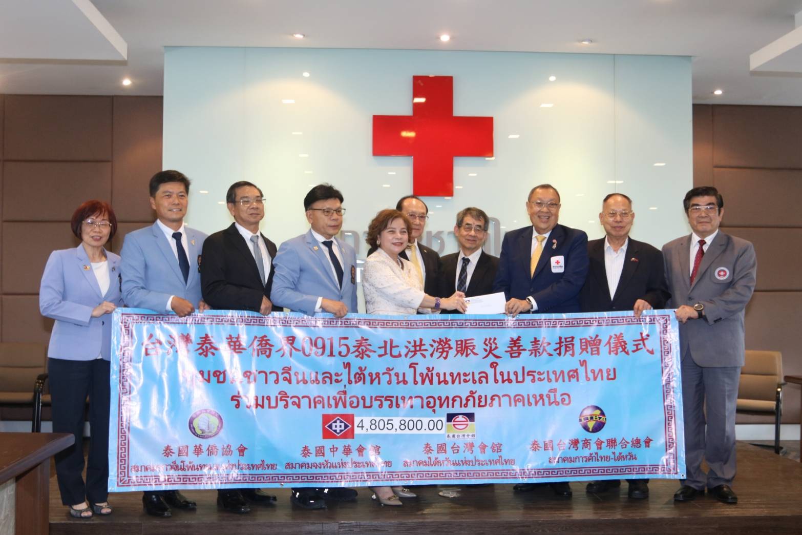 ณ.สำนักงานจัดหารายได้ สภากาชาดไทย มิสเตอร์ จางจวิ้นฝู (張俊福) ผู้อำนวยการใหญ่ สำนักงานเศรษฐกิจและวัฒนธรรมไทเปประจำประเทศไทย (TECO) นำ ดร.บรินดา จางขจรศักดิ์ นายกสมาคมไต้หวันแห่งประเทศไทย , นายพรชัย อยู่วิมลชัย ประธานสมาคมหัวเฉียวแห่งประเทศไทย และสมาคมชาวจีนโพ้นทะเลแห่งประเทศไทย , นายณรงค์ ดีโรจนวงศ์ ประธานสมาคมจงหัวแห่งประเทศไทย , และ มิสเตอร์ ฮั่น ชวน เฉิน นายกสมาคมการค้าไทย-ไต้หวัน พร้อมคณะนักธุรกิจชาวไตหวัน เดินทางมอบเงินบริจาครวม 4,805,800 บาท (สี่ล้านแปดแสนห้าพันแปดร้อยบาทถ้าน) ให้กับนายขรรค์ ประจวบเหมาะ ผู้อำนวยการสำนักงานจัดหารายได้ สภากากาดไทย เพื่อนำไปจัดถุงยังชีพ ช่วยเหลือพี่น้องชาวไทยที่กำลังประสบอุทกภัย พื้นที่ของภาคเหนือ ในจังหวัดเชียงราย น่าน พะเยา และเชียงใหม่