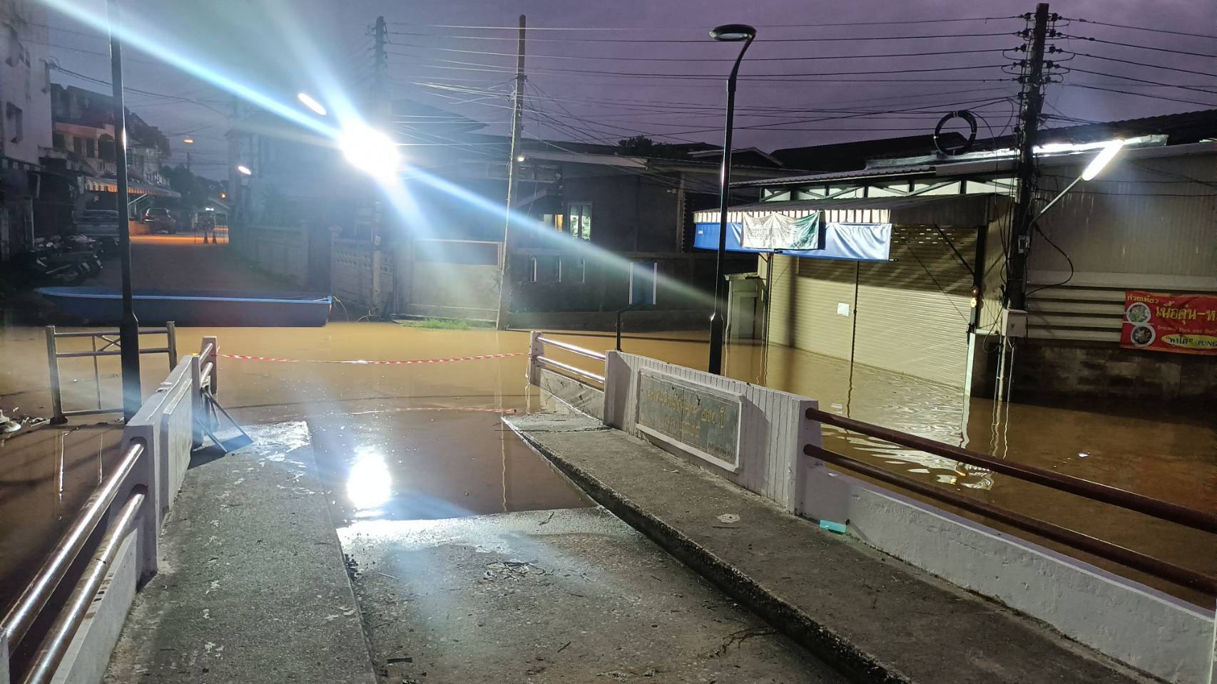 เช้ามืดวันนี้ที่ 26 กันยายน 2567 ที่บริเวณสะพานรัตนโกสิน 200 ปี ซึ่งเป็นสะพานเชื่อมต่อระหว่างชุมชนกาดกองต้า ต.สอนดอก และชุมชน ปงสนุก ต.เวียงเหนือ อ.เมืองลำปาง ได้มีการปปิดห้ามสัญจรผ่านเด็กขาดหลังจากที่ น้ำวังเอท่วมคอสะพาน และชุมชนติดริมน้ำวังทั้งสองฝากฝั่ง ซึ่งส่งผลกระทบให้เกิดน้ำเอ่อมท่วมพื้นที่ติดแม่น้ำวังไปหลายหลังคาเรือน ในส่วนชุมชนกาดกองต้า ที่ น้ำวังเอ่อทะลุท่อระบายน้ำเช้านี้พบว่าระดับน้ำเข้าท่วมบ้านเรือนชาวบ้านเช่นกันในจุดที่ต่ำสุดกลางชุมชน ส่วนบ้านเรือนใกล้เคียงต่างนำกระสอบทรายมาทำแนวกันน้ำเพื่อป้อกงันน้ำกันหลายหลังคาเรือน สถานการณ์ในพื้นที่ยังไม่วิกฤติ ที่ผ่านมาเจ้าหน้าที่งานป้องกันและบรรเทาสาธารณภัย และเจ้าหน้าที่เทศกิจ เทศบาลนครลำปาง ได้บรรจุกระสอบทราย เพื่อจัดเตรียมให้ประชาชนใช้ป้องกันน้ำท่วมบ้าน โดยมีประชาชนมาขอรับอย่างต่อเนื่องตลอดทั้งคืน ส่วนสถานการณ์น้ำเอ่อท่วมบ้านเรือนถนนสองฝากฝั่งแม่น้ำวังพบว่าหลายจุดไม่สามารถสัญจรเจ้าหน้าที่แจ้งปิดการสัญจรทันที