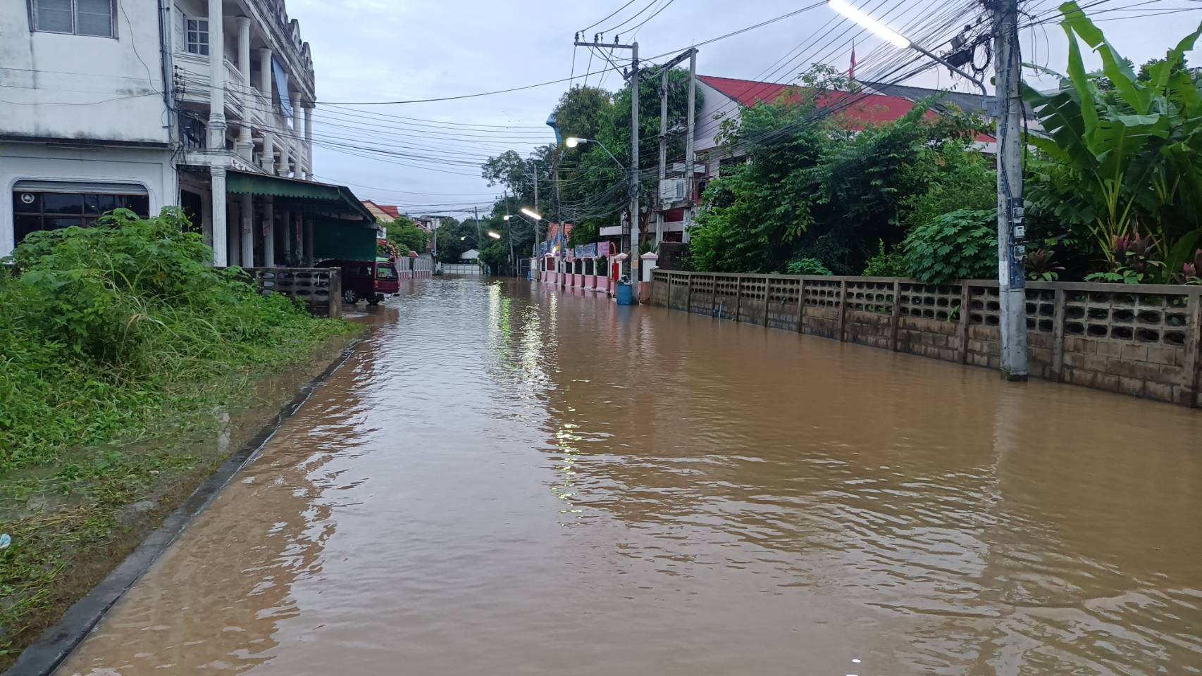 สถานการณ์แม่น้ำวังเอ่อท่วมย่านชุมนกาดกองต้าย่านเศษฐกิจชื่อดังของลำปาง ยังไม่วิกฤติระดับน้ำทรงตัวตลอดทั้งคืน ขณะที่มีโรงเรียนเอกชนชื่อดังอยู่ใกล้แม่น้ำวังสองแห่งประกาศหยุดเรียน 2 วันหลังน้ำเอ่อท่วมถนนหน้าโรงเพื่อความปลอดภัย