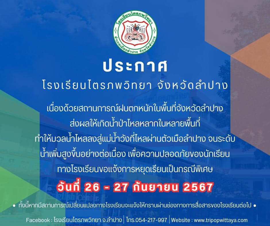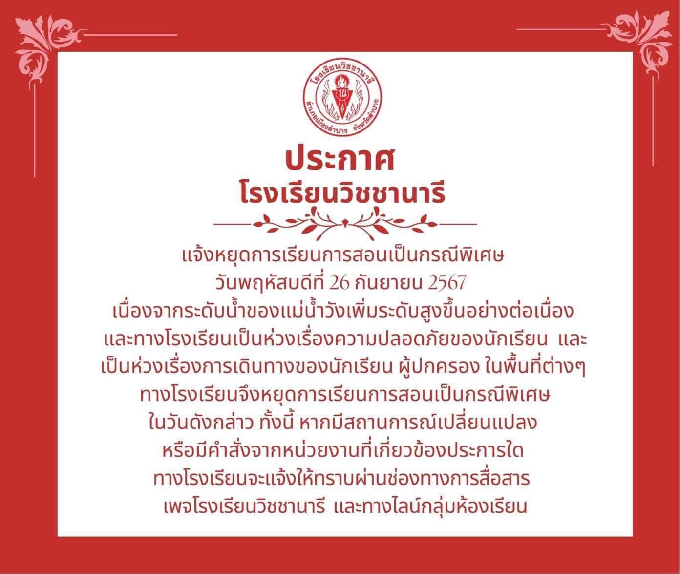 โดยเฉพาะถนนเจริญประเทศ ต.เวียงเหนือ อ.เมืองลำปาง ที่มี โรงเรียนเอกชน ชื่อดัง 2 แห่ง ตั้งอยู่ห่างไม่ไกลจากแม่น้ำวังมากนักและได้รับผลกระทบจากน้ำเอ่อท่วมในครั้งนี้ จึงได้ประกาศหยุดการเรียนการสอนกรณีพิเศษโดยโรงเรียนวิชานารี ประกาศหยุดเรียนวันที่ 26 กันยายน 2567 และโรงเรียนไตรภพวิทยา ปประกาศหยุดเรียนระหว่างวันที่ 26-27 กันยายน 2567 เนื่องจากระดับน้ำของแม่น้ำวังมีปริมาณสูงขึ้น จึงมีความห่วงใยเรื่องความปลอดภัยและการเดินทางของนักเรียน ตามประกาศของโรงเรียน สำหรับโรงเรียนโรงเรียนเคนเน็ตแม็คเคนซี ซึ่งด้านหลังติดแม่น้ำวังเช่นกัน ยังเปิดเรียนตามปกติผู้ปกครองสามารถ รับ-ส่ง บุตรหลานได้ โดยใช้เส้นทาง ถนนจามเทวี (เส้นหน้าโรงเรียน) ได้ตามปกติ