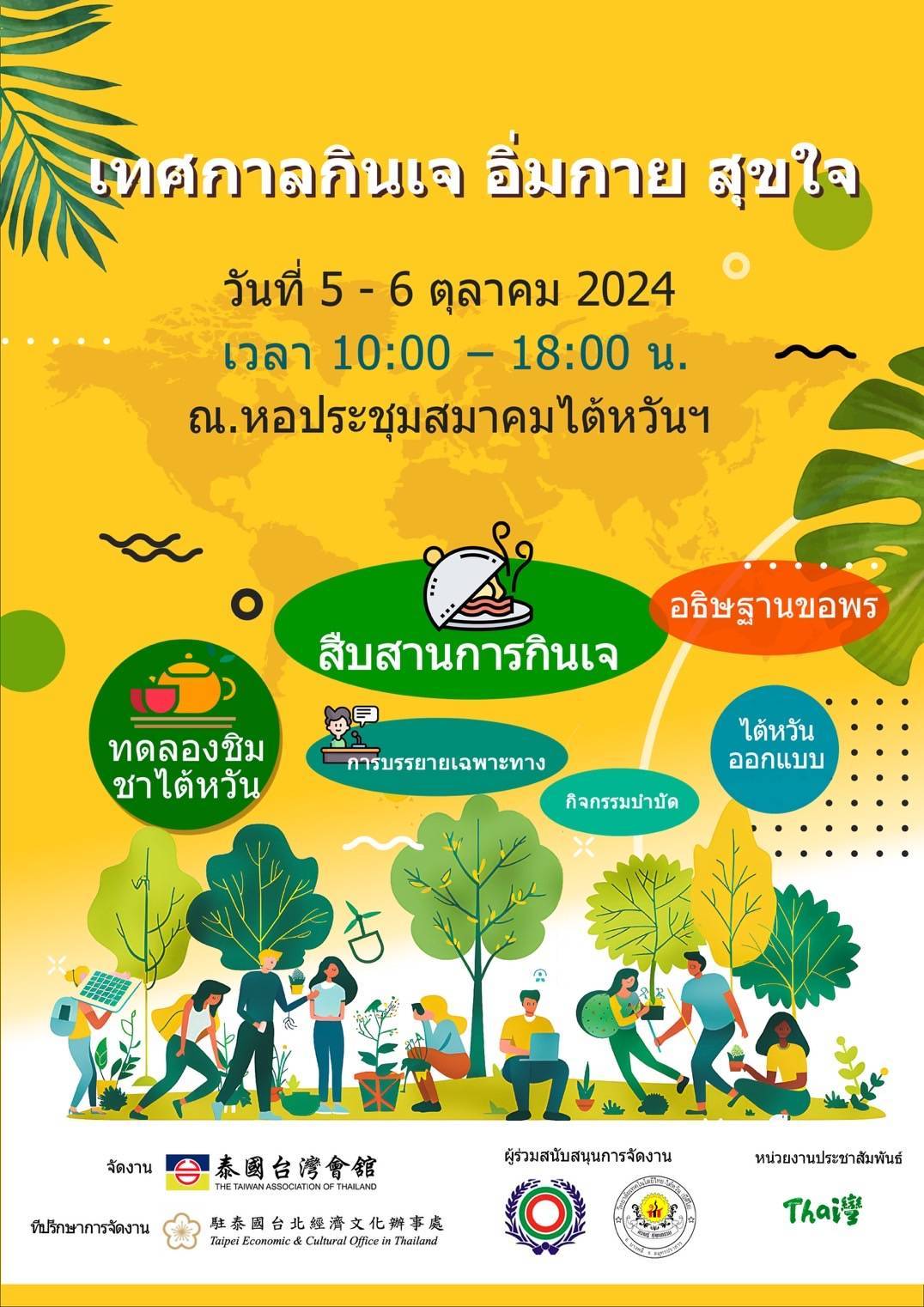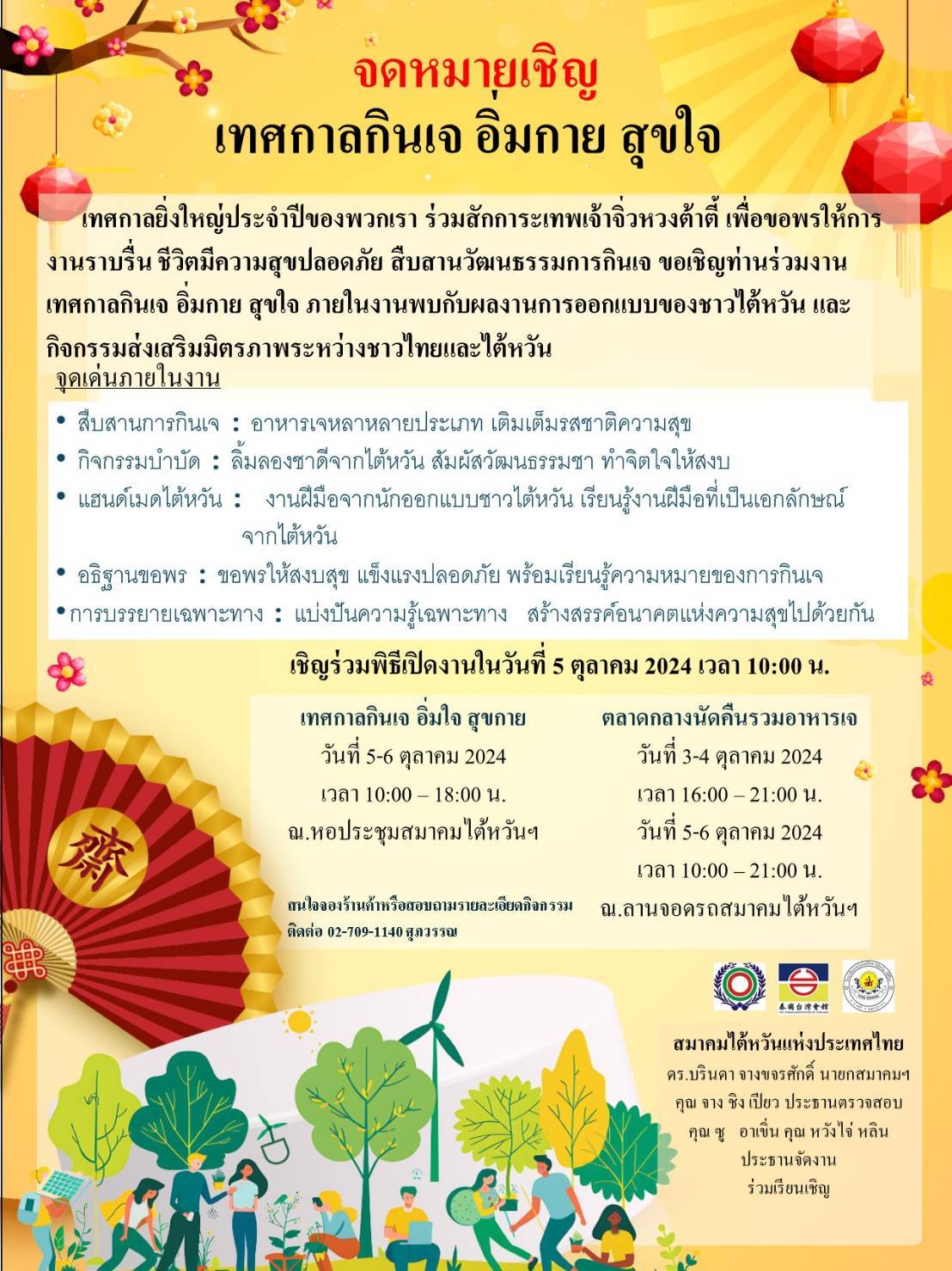 ใกล้เทศกาลกินเจ สมาคมไต้หวัน แห่งประเทศไทย เชิญชวนสาธุชน ถือศีลกินเจ ในงานเทศกาลกินเจ อิ่มกาย สุขใจ ที่นำเมนูอาหารเจ ต้นตำหรับจากไต้หวัน และร่วมสืบสานวัฒนธรรมการการจิบชาไต้หวันโบราณ 3-6 ตุลาคม