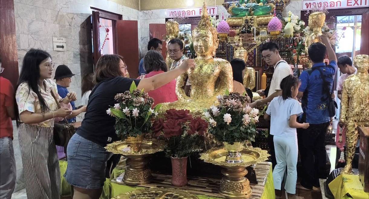 นักท่องเที่ยวส่องเลขเด็ดอ่างน้ำมนต์วัดหลวงพ่อปากแดง เข้ากราบไหว้หลวงพ่อปากแดง ขอพร โชคลาภ ธุรกิจ หน้าที่การงานพร้อมส่องเลขเด็ดในอ่างน้ำมนต์ 5 6 4 เลขสองตัว 71 - 90