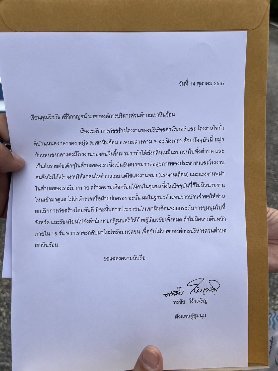 ด้านนายพรชัย โง้วเจริญ ตัวแทนผู้ชุมนุม ได้พูดตามหนังสือต่อหน้านายก อบต.เขาหินซ้อน และชาวบ้าน ที่ร่วมชุมนุม อ้างจากหนังสือเปิดผนึกลงวันที่ 14 ตุลาคม 2567 เรียนคุณวิชวัธ ศรีวิกาญจน์ นายกองค์การบริหารส่วนตำบลเขาหินซ้อน เรื่องระงับการก่อสร้างโรงงานของบริษัทสตาร์ริเวอร์ และ โรงงานไท่กั่ว ที่บ้านหนองกลางดง หมู่9 ต.เขาหินซ้อน อ.พนมสารคาม จ.ฉะเชิงเทรา ด้วยปัจจุบันนี้ หมู่ 9 บ้านหนองกลางดง มีโรงงานของคนจีนขึ้นมามากทำให้ส่งกลิ่นเหม็นรบกวนไปทั่วตำบล และเป็นอันรายต่อเด็กๆในตำบลของเรา ซึ่งเป็นอันตรายมากต่อสุขภาพของประชาชนและโรงงาน คนจีนไม่ได้สร้างงานให้แก่คนในตำบลเลย แต่ใช้แรงงานพม่า (แรงานเถื่อน) และแรงงานพม่าในตำบลของเรามีมากมาย สร้างความเดือดร้อนให้คนในชุมชน ซึ่งในปัจจุบันนี้ก็ไม่มีหน่วยงานไหนเข้ามาดูแล ไม่ว่าตำรวจหรือฝ่ายปกครอง ฉะนั้น ผมในฐานะตัวแทนชาวบ้านจำขอให้ท่านยกเลิกการก่อสร้างโดยทันที มิฉะนั้นทางประชาชนในเขาหินซ้อนจะยกระดับการชุมนุมไปที่จังหวัด และร้องมือนไปถึงสำนักนายกรัฐมนตรี ให้ข้างที่เกี่ยวข้องทั้งหมด ถ้าไม่มีควานคืบหน้าใน 15 วัน พวกเราจะกลับมาใหม่พร้อมมวลชน เพื่อขับไล่นายกองค์การบริหารเขาหินซ้อน ขอแสดงความนับถือ พร้อมลงรายมือชื่อพรชัย โง้วเจริญ ตัวแทนผู้ชุมนุม