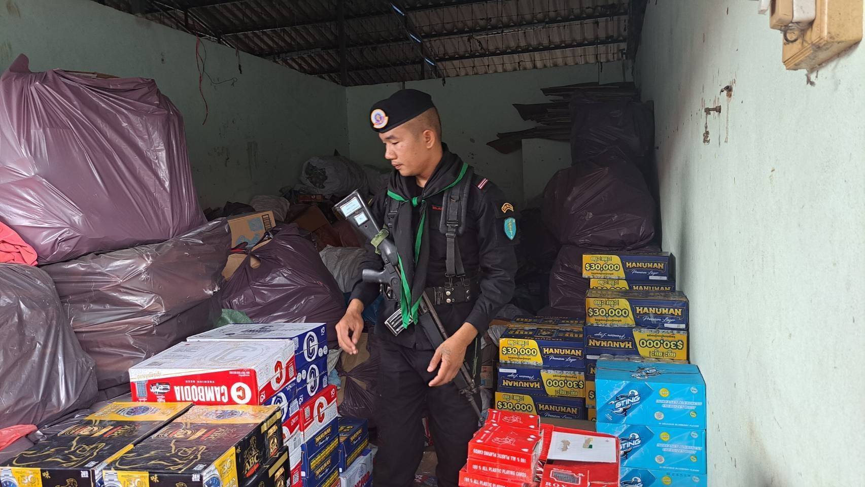 เมื่อเวลา 09.00 น.วันที่ 27 ต.ค.67 ผู้สื่อข่าวรายงาน พ.อ.กรินทร์ อุตสาหะ ผู้บังคับการชุดควบคุมกรมทหารพรานที่13 หน่วยเฉพาะกิจอรัญประเทศ กองกำลังบูรพา(ผบ.ชค.ทพ.13ฉก.อรัญประเทศ กกล.บูรพา) ได้สั่งการให้ ร.ท.ถาวร บุญเพ็ง ผู้บังคับกองร้อยทหารพรานที่1302 จัดกำลังพล ร้อย ทพ.1302 ประสานความร่วมมือกับ สรรพสามิตพื้นที่สระแก้ว และ พ.ต.อ.อโณทัย จินดามณี ผกก.สภ. คลองลึก จ.สระแก้ว บูรณาการกำลังร่วมกันเข้าตรวจสอบโกดังเก็บสินค้า ห้องหมายเลข A4/1-1 และ A3/4-1 ลักษณะเป็นตึกแถวให้เช่าชั้นเดียว บริเวณซอยข้างห้างสรรพสินค้าบิ๊กซี สาขาตลาดโรงเกลือ พื้นที่บ้านดงงู ม.7 ต.ป่าไร่ อ.อรัญประเทศ จ.สระแก้ว หลัง จนท.ร่วมกันสืบทราบว่าเป็นสถานที่ซุกซ่อนเบียร์และบุหรี่ต่างประเทศเถื่อนที่ลักลอบนำเข้ามาจากประเทศกัมพูชา เตรียมรอส่งขายให้กับนักท่องเที่ยวที่เดินทางมาเที่ยวตลาดโรงเกลือ ตลาดการค้าชายแดน อ.อรัญประเทศ จ.สระแก้ว ในช่วงเทศกาลลอยกระทง