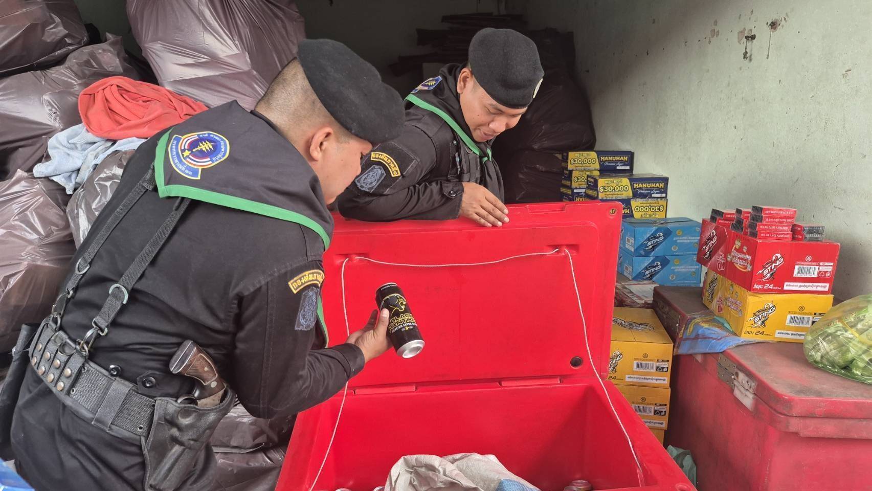 เมื่อ จนท.นำกำลังบุกเข้าไปถึงหน้าซอยพบชายกลุ่มหนึ่งประมาณ3-4คน คาดว่าเป็นชาวกัมพูชา กำลังขนสินค้าอยู่ภายในโกดังเก็บสินค้าห้องหมายเลข A4/1-1 และ A3/4-1 เมื่อเห็น จนท.กลุ่มชายชาวกัมพูชาได้รีบปิดประตูม้วนหน้าโกดังแล้วแยกย้ายวิ่งกันหลบหนีไป เมื่อ จนท.บุกไปถึงได้เปิดประตูออกดูพบภายในโกดังเก็บสินค้า ห้องหมายเลข A4/1-1 และ A3/4-1 มีเบียร์ต่างประเทศชนิดกระป๋องบรรจุในลังกระดาษซุกซ่อนปะปนอยู่กับสินค้าเบ็ดเตล็ดภายในโกดังจำนวนมาก เมื่อ จนท.ตรวจสอบพบว่าเป็นสุราแช่ชนิดเบียร์ บรรจุกระป๋อง ที่มิได้เสียภาษีหรือขออนุญาตนำเข้าราชอาณาจักรแต่อย่างใด นอกจากนี้ยังพบบุหรี่ต่างประเทศเถื่อน ยี่ห้อ FINE ซุกซ่อนอยู่อีก 50ซอง จนท.จึงได้ร่วมกันตรวจยึด เบียร์เถื่อนทั้งหมดรวม 1440 กระป๋อง ประกอบด้วยเบียร์ตรา HANUMAN PREMIUM LAGER 4.9 ดีกรี จำนวน 1,080 กระป๋อง,เบียร์ตรา CAMBODIA LITE 4 ดีกรี จำนวน 96 กระป๋อง, เบียร์ตราCAMBODIA LITE 4 ดีกรี จำนวน 96 กระป๋อง, เบียร์ตราABC 8.0 ดีกรี จำนวน 96 กระป๋อง และบุหรี่ยี่ห้อ FINE จำนวน50ซอง มาตรวจสอบที่ กองร้อยทหารพรานที่1302 จุดตรวจ อ.20 ด่านพรมแดนคลองลึก อ.อรัญประเทศ จ.สระแก้ว ก่อนมอบให้ จนท.สรรพสามิตพื้นที่สระแก้ว นำส่งพนักงานสอบสวน สภ.คลองลึก อ.อรัญประเทศ จ.สระแก้ว ดำเนินการตามกฏหมายและสืบสวนหาตัวผู้กระทำมาดำเนินคดีต่อไป