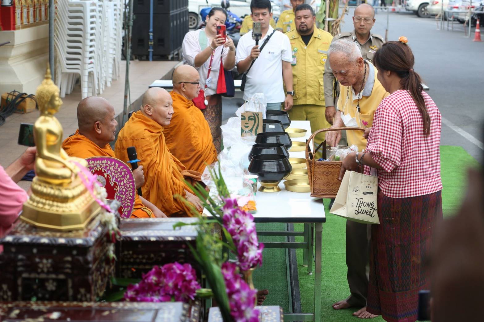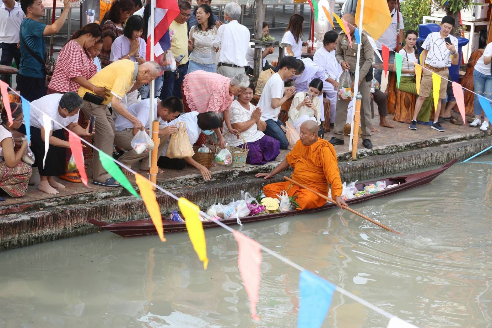 พระครูแจ้ เจ้าอาวาสวัดบางพลีใหญ่กลาง นำพระสงฆ์พายเรือรับบิณฑบาตทางน้ำ เนื่องในงานประเพณีลอยกระทง ประจำปี 2567