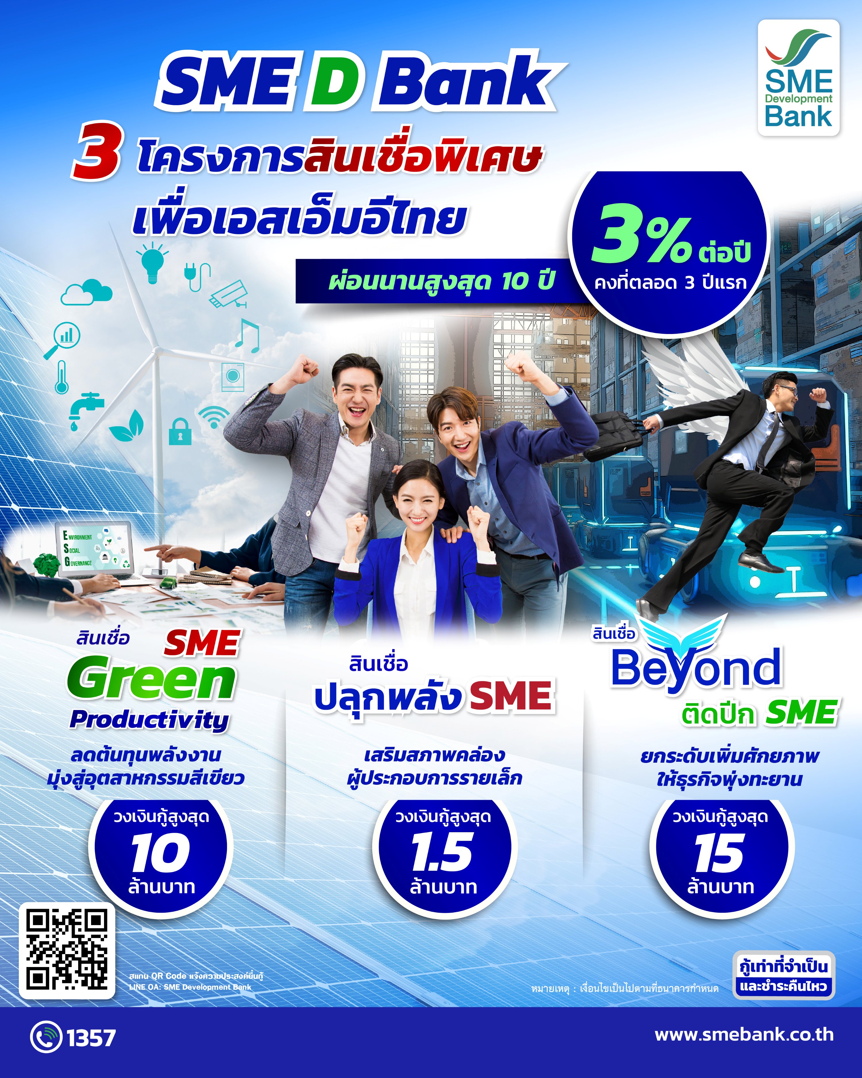 2.สินเชื่อ "ปลุกพลัง SME" สำหรับผู้ประกอบการเอสเอ็มอีรายเล็กที่มีรายได้ต่อปีไม่เกิน 2 ล้านบาท นำไปใช้ลงทุน ขยาย ปรับปรุงกิจการ หรือปรับเปลี่ยนรูปแบบการดำเนินธุรกิจ รวมถึง หมุนเวียน และเสริมสภาพคล่องในธุรกิจ เช่น ร้านโชห่วย/ขายปลีก ร้านอาหาร ธุรกิจดิจิทัล/อิเล็กทรอนิกส์ ร้านขายยา และแฟรนไชส์รายย่อย เป็นต้น วงเงินกู้ต่อรายสูงสุด 1.5 ล้านบาท และ 3.สินเชื่อ "Beyond ติดปีก SME" สำหรับผู้ประกอบการเอสเอ็มอีที่มีรายได้ต่อปีมากกว่า 2 ล้านบาทขึ้นไป นำไปเสริมสภาพคล่อง ลงทุน ขยาย ปรับปรุงกิจการ ปรับเปลี่ยนทรัพย์สินหรือเครื่องจักร เพื่อเพิ่มศักยภาพการดำเนินธุรกิจ เช่น เกษตรแปรรูป อาหารเพื่อสุขภาพ โรงแรมที่พัก/ร้านอาหารขนาดใหญ่ ธุรกิจนำเข้าติดตั้งเครื่องจักร ธุรกิจบริการดิจิทัล/อิเล็กทรอนิกส์ แฟรนไชส์ เป็นต้น วงเงินกู้สูงสุด 15 ล้านบาท