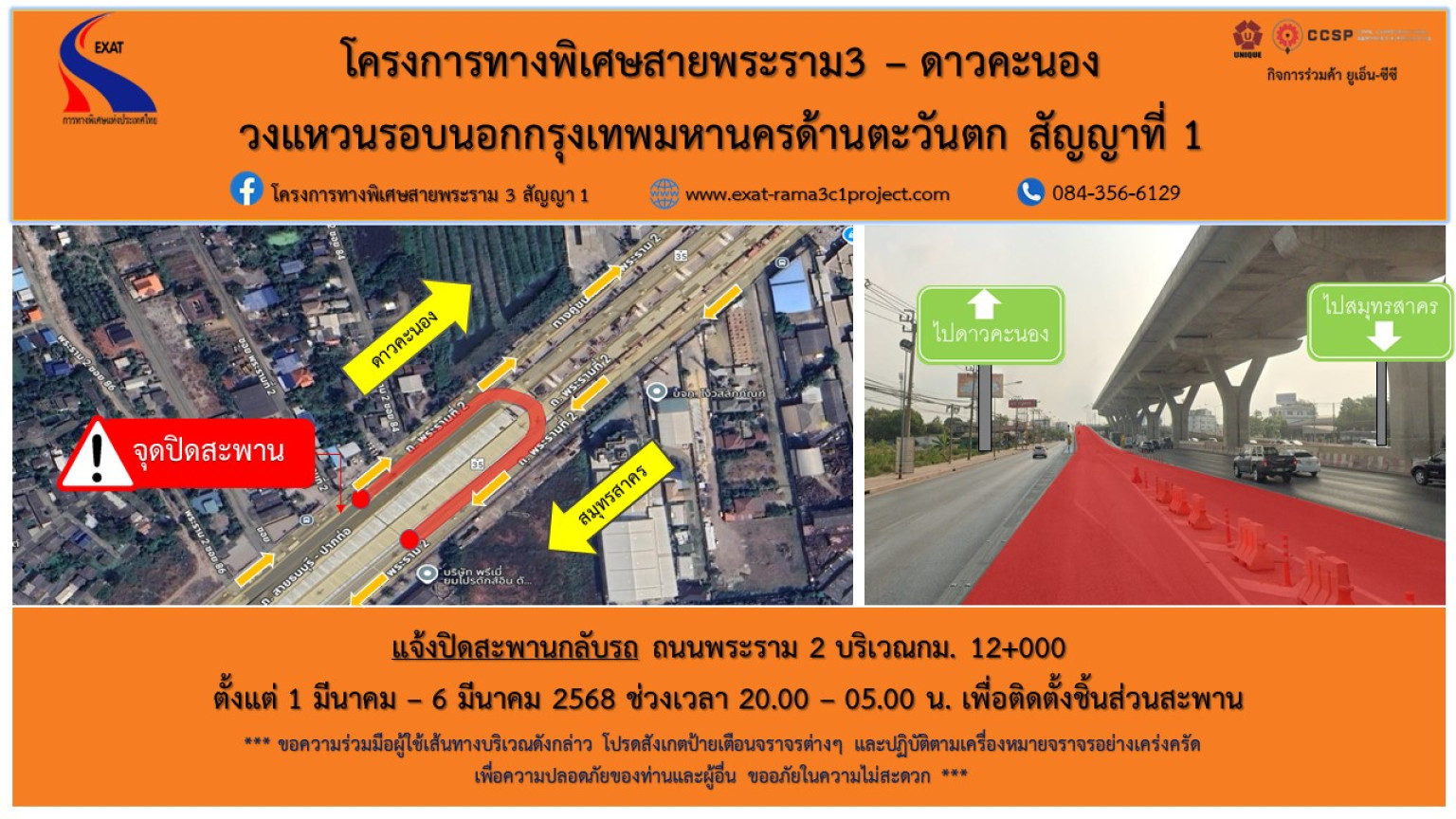 การทางพิเศษแห่งประเทศไทย (กทพ.) กระทรวงคมนาคม ได้ว่าจ้างกิจการร่วมค้า ยูเอ็น - ซีซี เป็นผู้รับจ้างดำเนินโครงการทางพิเศษสายพระราม 3 - ดาวคะนอง - วงแหวนรอบนอกกรุงเทพมหานคร ด้านตะวันตก สัญญาที่ 1 โดยผู้รับจ้างจะเข้าดำเนินการติดตั้งชิ้นส่วนสะพานสำเร็จรูป ดังนั้น เพื่อเร่งติดตั้งชิ้นส่วนสะพานดังกล่าวให้แล้วเสร็จโดยเร็ว จึงมีความจำเป็นต้องปิดสะพานกลับรถถนนพระราม 2 กม.12+000 (บริเวณชุมชนโฟร์โมสต์) เพื่อติดตั้งชิ้นส่วนสะพานดังกล่าว โดยสามารถกลับรถได้บริเวณใต้ทางต่างระดับบางขุนเทียนทดแทน ตั้งแต่วันที่ 1 - 6 มีนาคม 2568 เวลา 20.00 - 05.00 น.