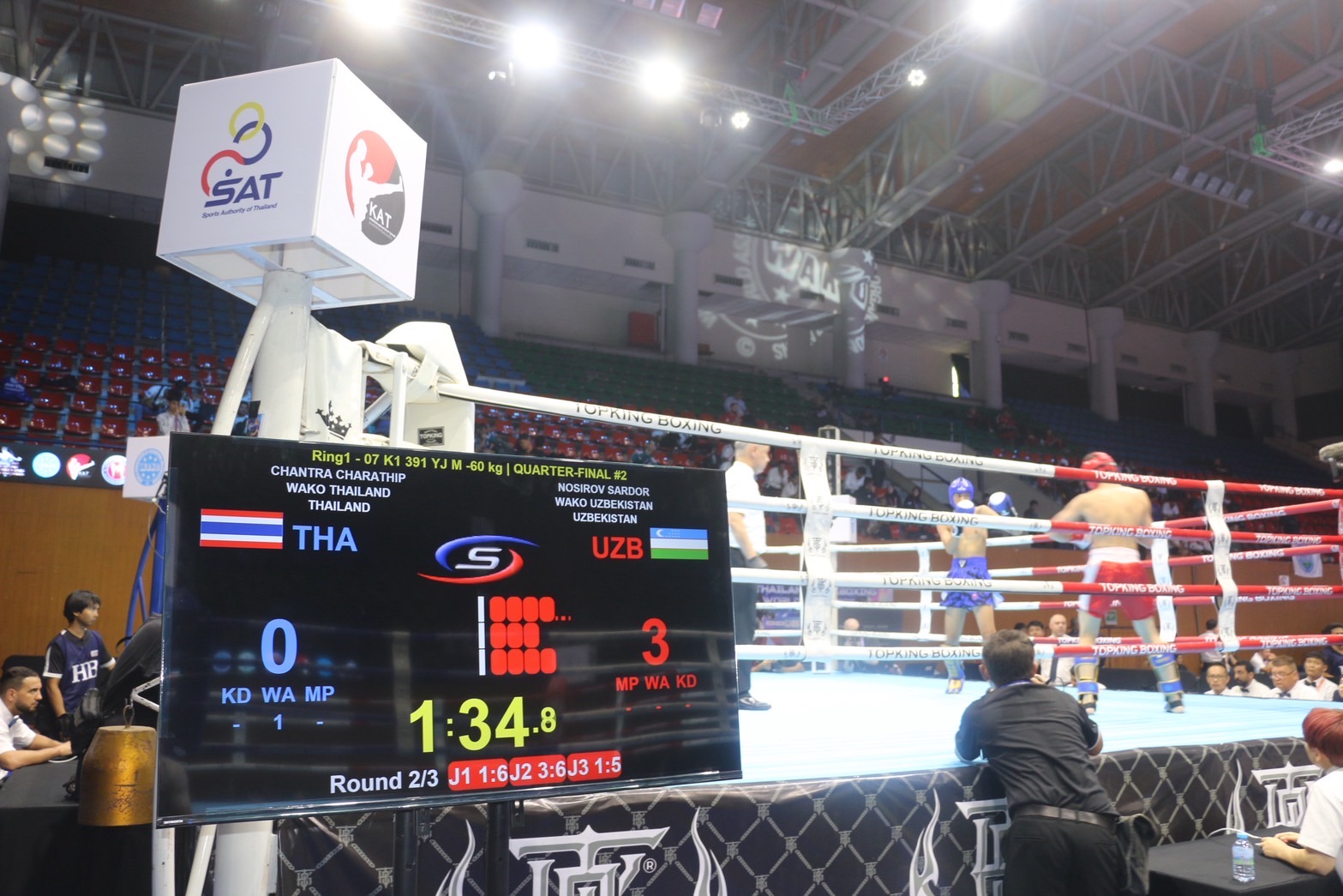 สำหรับ ผลการแข่งขันวันแรก ประเภทริง สปอร์ต ที่แบ่งเป็น 3 ประเภท เริ่มจาก ประเภทฟูลคอนแท็ก รุ่น 63.5 กก.ชาย รอบแรก หรือ รอบก่อนรองชนะเลิศ "ษิณ" ทักษิณ ถาพันธ์ นักมวยไทยจากศรีสะเกษ แข่งครั้งแรก สามารถเอาชนะคะแนน คู่แข่งจาก เติร์กเมนิสถาน อัลลาเบอร์ดีเยฟ มูฮัมเหม็ดเบอร์ดี ผ่านเข้ารอบรองชนะเลิศ ได้สำเร็จ