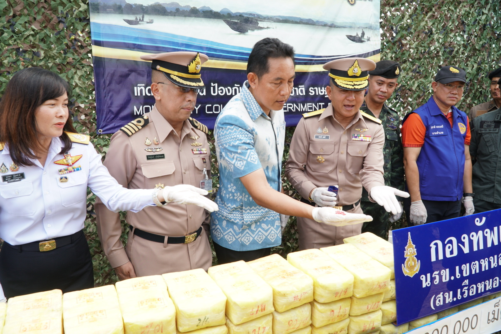 วันที่ 7 พ.ค.68 ที่สถานีเรือหนองคาย นายไพฑูรย์ มหาชื่นใจ รองผู้ว่าราชการจังหวัดหนองคาย,พลเรือตรีณรงค์ เอมดี ผบ.นรข., น.อ.วิศิษฐ์พงศ์ เจริญวิชยเดช ผบ.นรข.เขตหนองคาย, น.ท.อริยะ ทองมั่น หัวหน้าสถานีเรือหนองคาย ทหารเรือ, นางสาววรรณา ผู้อุตส่าห์ ผู้อำนวยการสำนักงานศุลกากรหนองคาย,พันเอกเรวัฒ ธรรมจิรเดช รองผู้บังคับการกองบังคับการควบคุมที่ 2 กองกำลังสุรศักดิ์มนตรี (ร.13),พ.ต.อ.จิรวิทย์ ปานยิ้ม ผกก.สภ.เมืองหนองคาย, พ.ต.ท.ธียาฌพัตท์ รังสิพราหมณกุล รองผกก.ตม.หนองคาย, ตำรวจ ฝ่ายปกครอง พร้อมหน่วยงานที่เกี่ยวข้อง ได้ร่วมกันแถลงข่าวการตรวจยึดยาบ้า 10 กระสอบ จำนวน 3 ล้านเม็ด มูลค่าประมาณ 100 ล้านบาท
