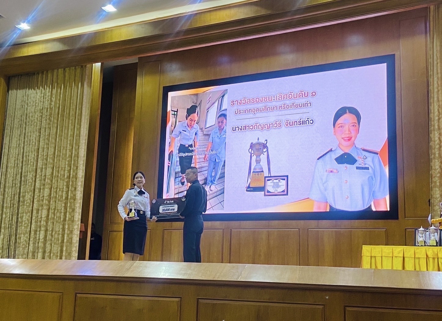 วันที่ 5 ก.ย 2568 นพร.กัญญาวีร์ จันทร์แก้ว ชั้นปีที่ 3 เข้ารับถ้วยรางวัลและเงินรางวัล จาก พลตรี สุวิทย์ เกตุศรี รองเสนาธิการทหาร ในโอกาสที่ได้รับรางวัลรองชนะเลิศ อันดับที่ 1 (ประเภทอุดมศึกษา ปริญญาตรีหรือ เทียบเท่า) ในการประกวดคลิป TikTok ในหัวข้อ “เหตุผลของการทำความดี“