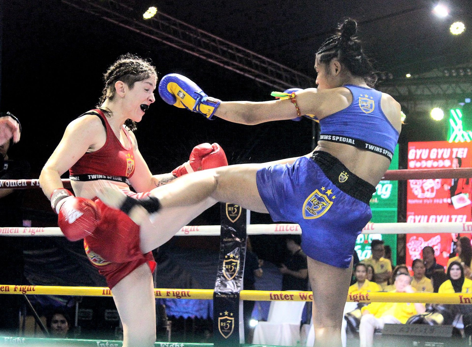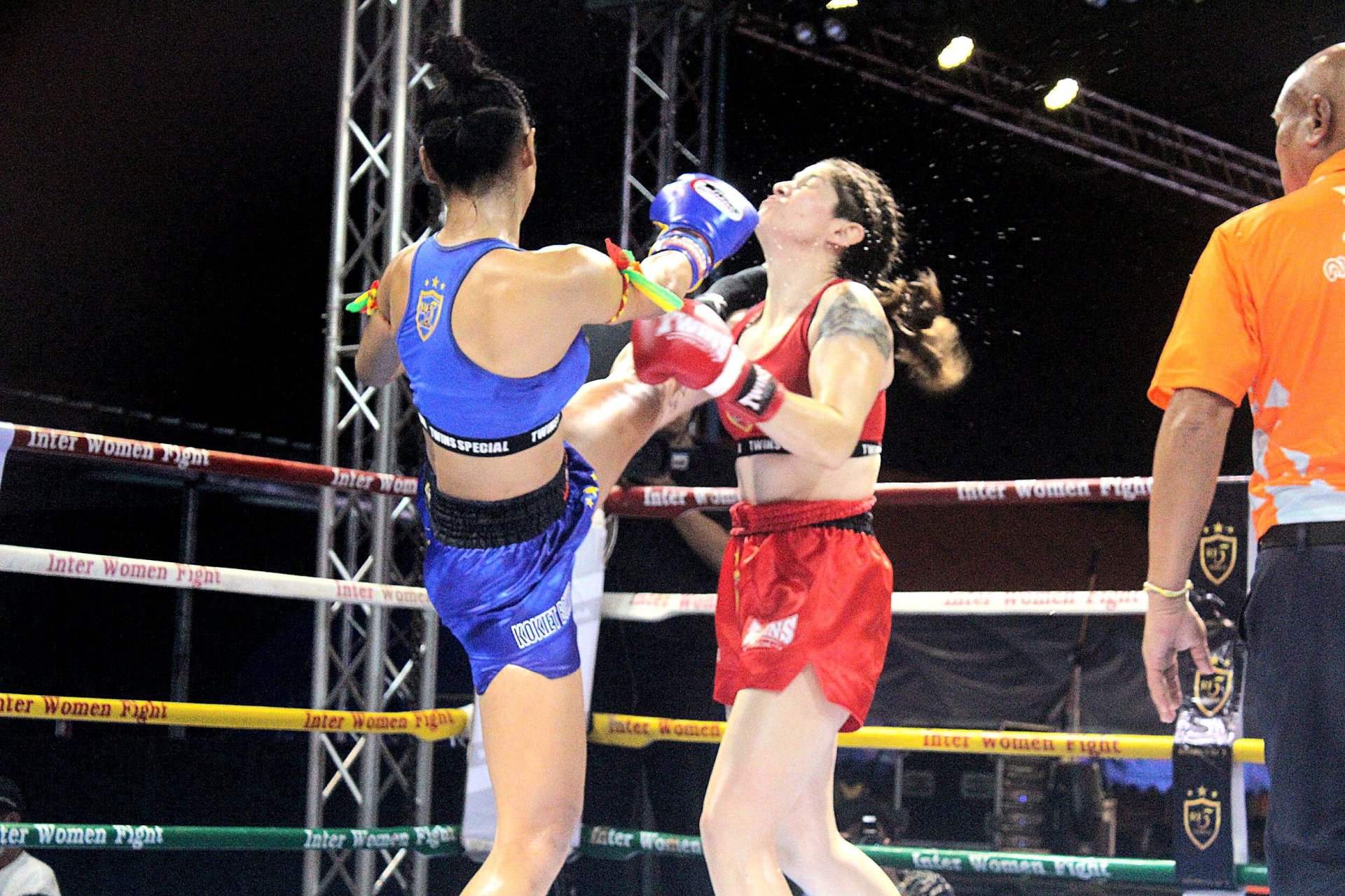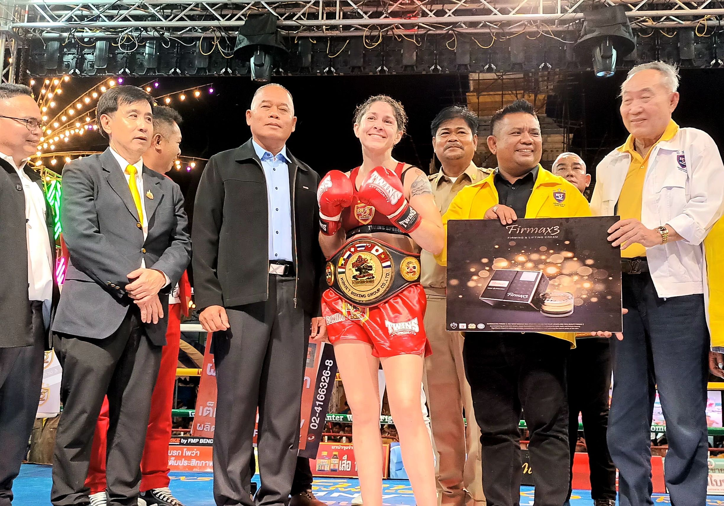 คู่ที่ 1 ชิงแชมป์มวยไทยนานาชาติ (หญิง) รุ่น 56 กก.เมแกน แม็คเนลลิส กำปั้นสาวชาวอเมริกัน อาศัยรูปร่างได้เปรียบเดินออกอาวุธใส่นักชกสาวไทยเจ้าถิ่น กิ่งแก้ว อินทร์ยิ้มมวยไทย ซึ่งก็ออกอาวุธตอบโต้ตลอดแต่ลูกหนักหน่วงเป็นของกำปั้นสาวอเมริกันครบ 3 ยกกรรมการชูมือให้ เมแกน แม็คเนลิส ชนะคะแนน 29 : 28 คว้าเข็มขัดมวยไทยนานาชาติรุ่น 56 กก.หญิงไปครอง