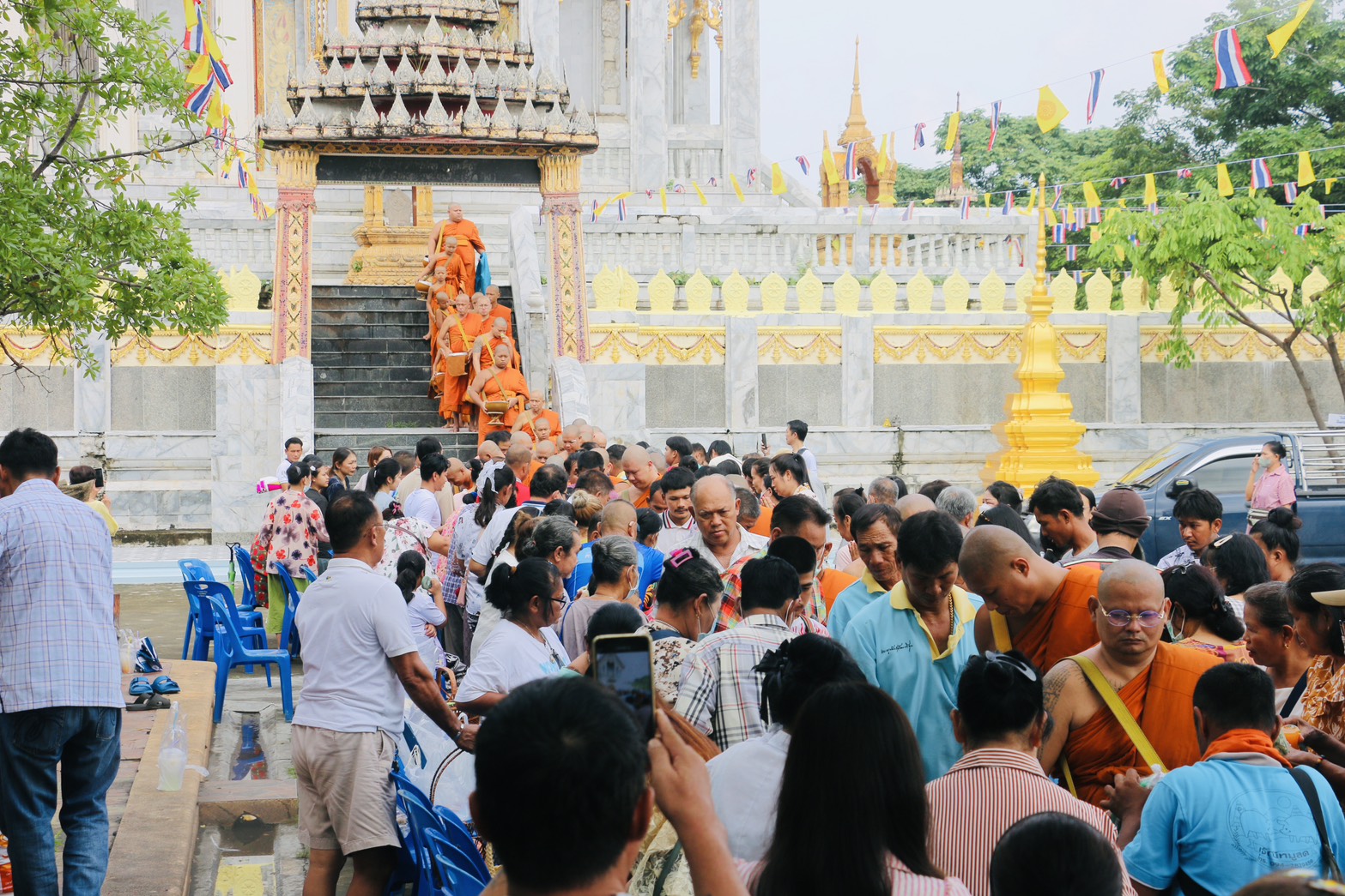 พุทธศาสนิกชน ต.ศรีจรเข้ใหญ่ อ.บางเสาธง จ.สมุทรปราการ ต่างพาบุตรหลาน สวมชุดขาวมาทั้งครอบครัว ร่วมมาทำบุญตักบาตรโวโรหณะ เนื่องในวันออกพรรษา ประจำปี 2568