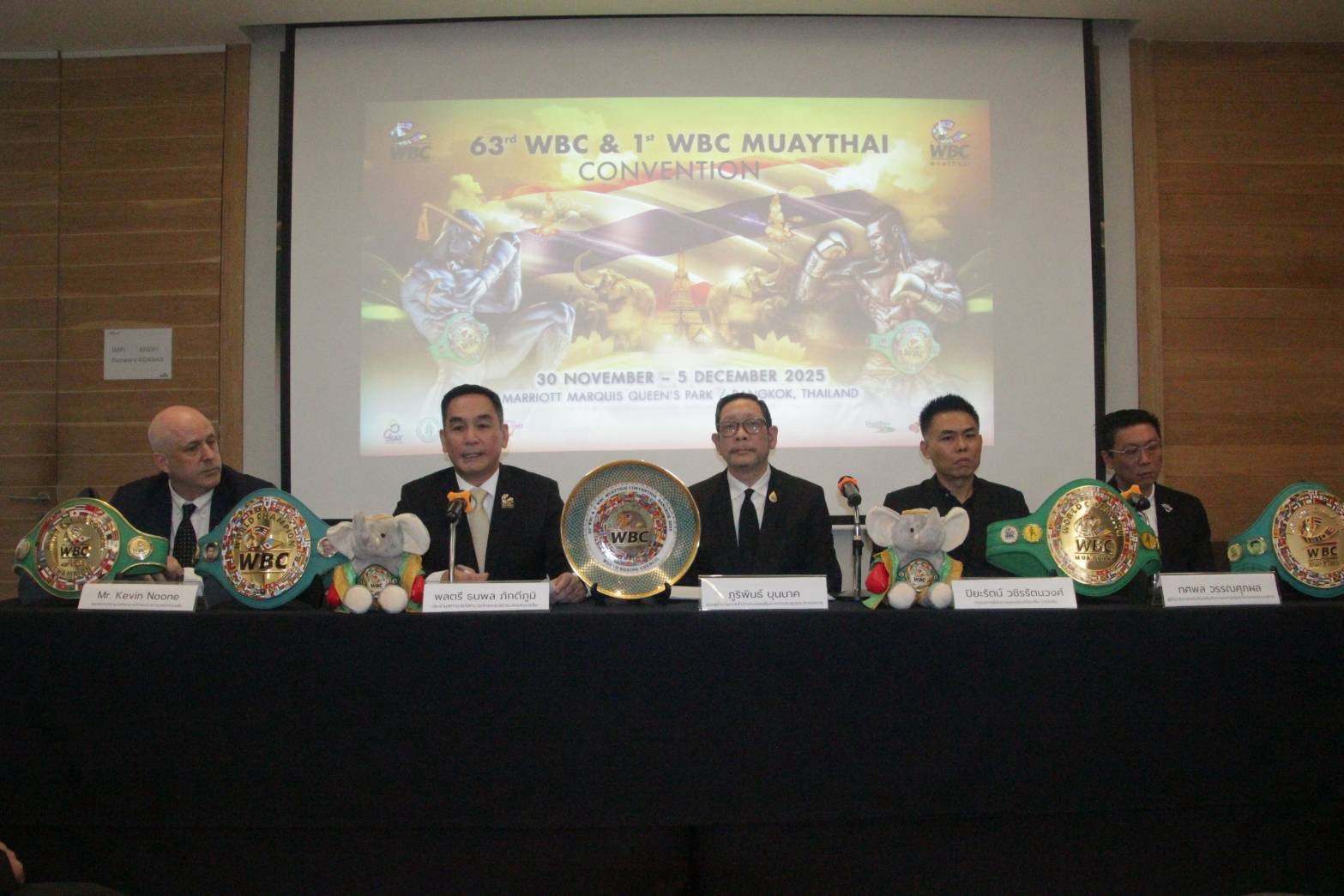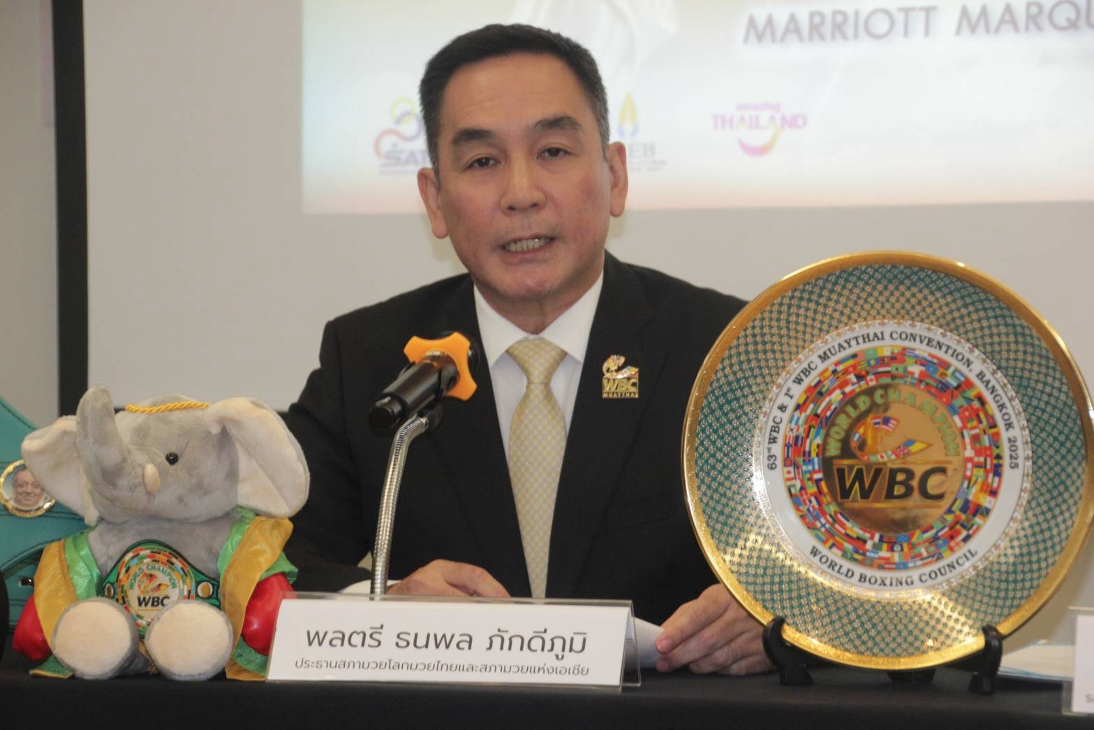 เมื่อเวลา 14.00 น. วันพุธที่ 5 พ.ย.68 ที่สำนักงานสภามวยแห่งเอเชีย ถนนพหลโยธิน ซอย 3 กทม. พล.ต.ธนพล ภักดีภูมิ ประธานสภามวยโลก มวยไทย และ ประธานสภามวยแห่งเอเชีย (WBC Asia) พร้อมด้วย นายทศพล วรรณศุภผล ผอ.กองส่งเสริมกิจกรรมการท่องเที่ยวแห่งประเทศไทย นายภูริพันธ์ บุนนาค รอง ผอ.อาวุโสสำนักงานส่งเสริมการจัดประชุมและนิทรรศการ (TCEB) นายปิยะรัตน์ วชิรรัตนวงศ์ กรรมการผู้จัดการเพชรยินดีบ๊อกซิ่งโปรโมชั่น และ นายเควิน นูน เลขาธิการสภามวยโลก มวยไทย และสภามวยแห่งเอเชียร่วมกันแถลงข่าวการจัดงาน “มวยไทยสู่มวยโลก” หรือ “WBC Convention ครั้งที่ 63” และ “WBC Muaythai Convention ครั้งที่ 1” และการแข่งขันมวยชิงแชมป์โลกในงาน Convention ระหว่างวันที่ 30 พ.ย. – 5 ธ.ค.68 ณ โรงแรมแบงค็อก แมริออท มาร์คีส์ ควีนส์ปาร์ค ซอยสุขุมวิท 22 รวมถึงบริเวณอุทยานเบญจสิริ คาดว่าจะมีผู้มาร่วมงานจากทั่วโลกมากกว่า 2,000 คน โดยจะมีการเผยแพร่ประชาสัมพันธ์ข่าวสารความเคลื่อนไหวการประชุมไปยังประเทศสมาชิกกว่า 176 ประเทศ ซึ่งหนึ่งในไฮไลต์ของงานคือ การรวมสุดยอดนักมวยจากประเทศสมาชิกแข่งขันชกชิงเข็มขัดแชมป์สภามวยโลก WBC , WBC Asia และ WBC Muaythai กว่า 10 เส้น
