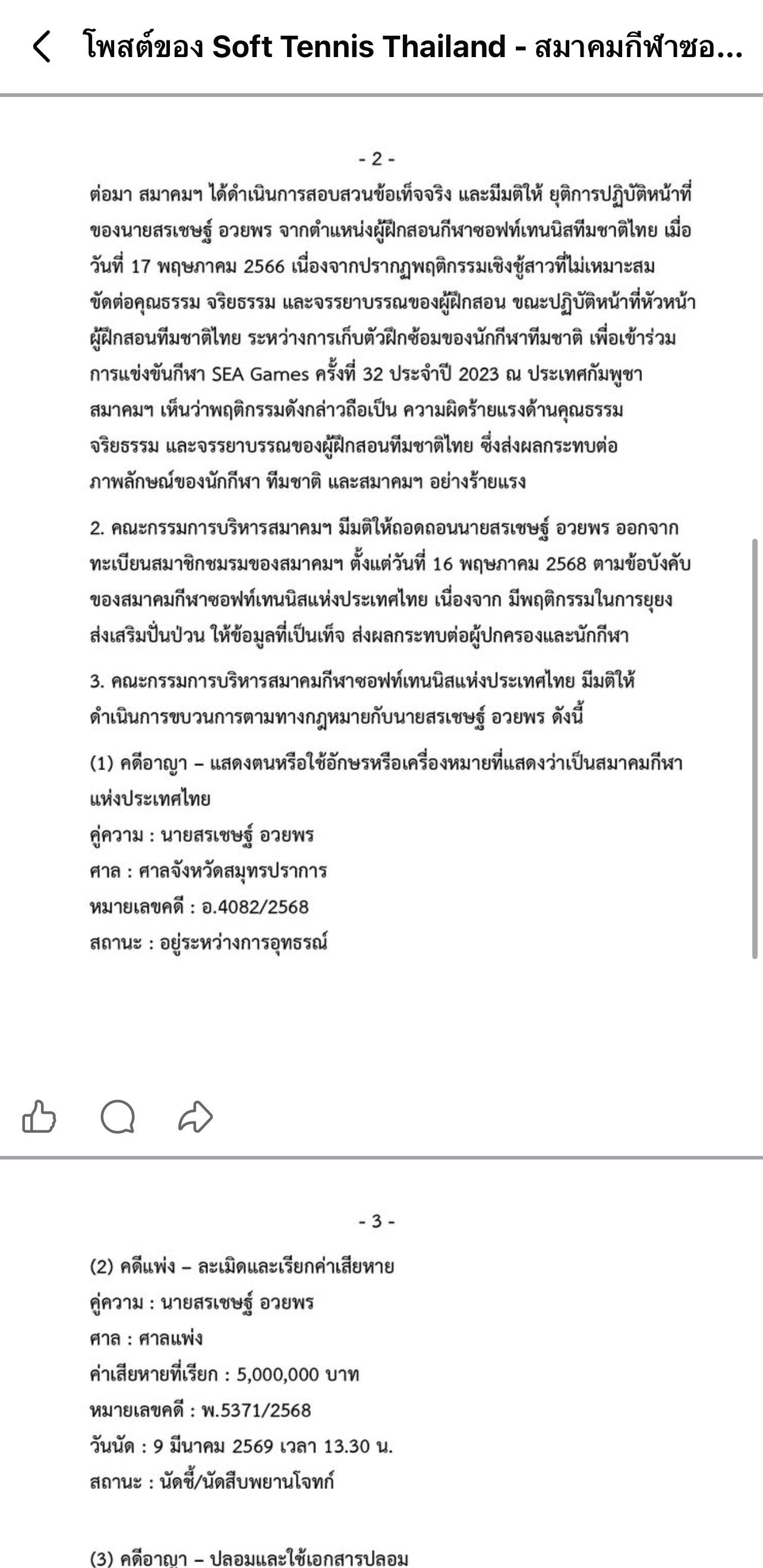 1.สมาคมกีฬาซอฟท์เทนนิสแห่งประเทศไทย ได้รับเรื่องร้องเรียนจากนักกีฬาหญิง