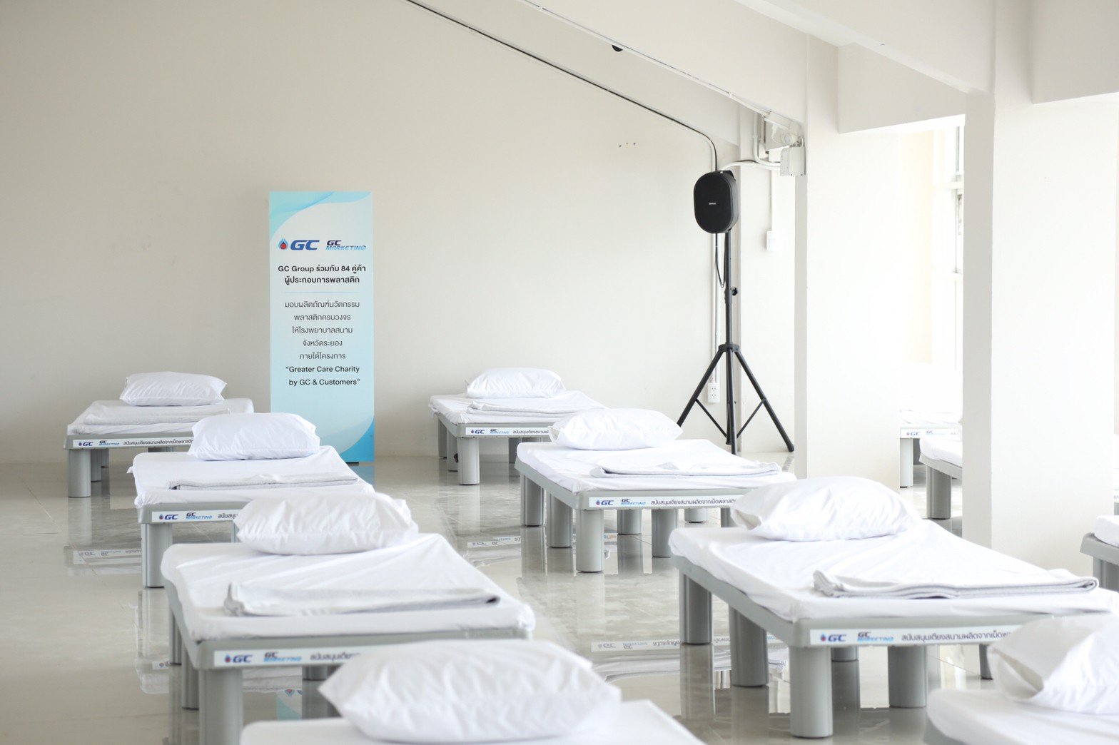 • เตียงสนามจาก HDPE (พร้อมอุปกรณ์เครื่องนอนครบชุด) จำนวน 1,000 เตียง ผลิตจากเม็ดพลาสติก HDPE ภายใต้แบรนด์ InnoPlus ของ GC ออกแบบและผลิตโดยบริษัทแอร์โรคลาส จำกัด คู่ค้าของ GC เตียงสามารถถอดประกอบได้ง่ายด้วยคนเพียงคนเดียวภายในเวลาไม่ถึง 5 นาที ขนาดใหญ่ (กว้าง 91 ซม. ยาว 210 ซม. สูง 30 ซม.) น้ำหนักเบาเพียง 21 กิโลกรัม มีความแข็งแรงทนทาน รับน้ำหนักได้มากถึง 200 กิโลกรัม ป้องกันสารคัดหลั่งซึมผ่าน สามารถฆ่าเชื้อได้ง่ายทั้งด้วยน้ำยาและผ่านความร้อน จึงนำกลับมาใช้ซ้ำได้หลายครั้ง รวมถึงสามารถนำกลับมารีไซเคิลได้ในที่สุด