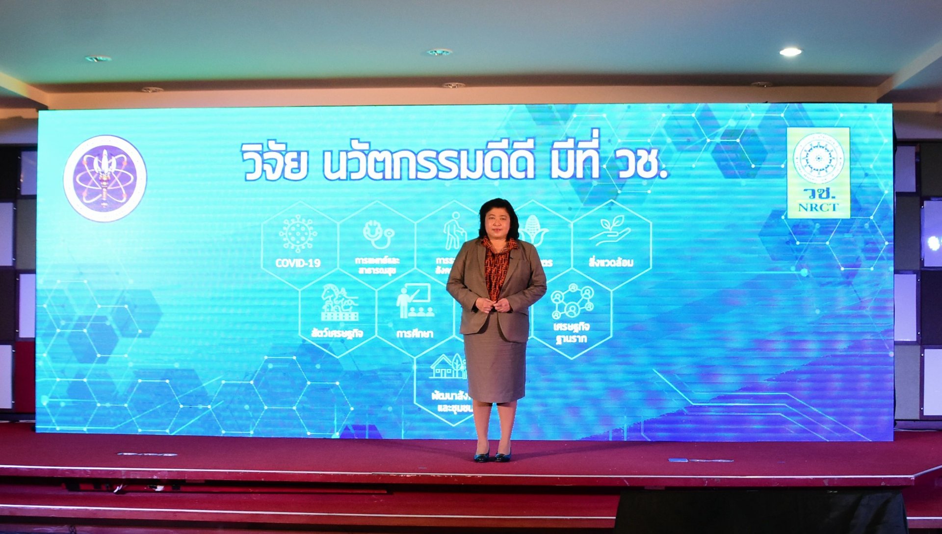 ดร.วิภารัตน์ ดีอ่อง ผู้อำนวยการสำนักงานการวิจัยแห่งชาติ ได้นำเสนอผลงานวิจัยและนวัตกรรม ที่ วช. ให้การสนับสนุนจนสามารถนำไปต่อยอดและใช้ประโยชน์ได้อย่างเป็นรูปธรรม ในปี 2564 ชี้ให้เห็นว่า วช. ได้วางกรอบแนวทางบริหารจัดการทุนไว้อย่างชัดเจน ภายใต้แผนด้านวิทยาศาสตร์ วิจัยและนวัตกรรมของประเทศ ของกระทรวงการอุดมศึกษา วิทยาศาสตร์ วิจัยและนวัตกรรม (อว.) และเนื่องจากสภาวะการเปลี่ยนแปลงของโลก จากปัญหาสิ่งแวดล้อมและโรคอุบัติใหม่ที่เกิดขึ้น อย่างเช่นสถานการณ์การแพร่ระบาดของโรคโควิด -19 เป็นโรคอุบัติใหม่ที่แพร่ระบาดไปทั่วโลก โดยเฉพาะในช่วง 1-2 ปีที่ผ่านมานี้ ได้สนับสนุนการใช้วิจัยและนวัตกรรมฝีมือคนไทยที่เกี่ยวข้องกับสถานการณ์โควิด-19 ทั้งมิตินวัตกรรม และวิชาการ ตอบรับความต้องการของบุคลากรได้ถึง 3 เฟส ของการแพร่ระบาด และมีความก้าวหน้าเป็นไปตามมาตรฐานการวิจัย วช. จึงนำผลงานวิจัยและนวัตกรรมพร้อมใช้มาถ่ายทอดองค์ความรู้ ให้แก่สังคม เพื่อช่วยแก้ปัญหา สร้างโอกาสช่วยลดผลกระทบจากสถานการณ์ทั้งในปัจจุบันและภายหลังสถานการณ์การแพร่ระบาดของโรคโควิด -19
