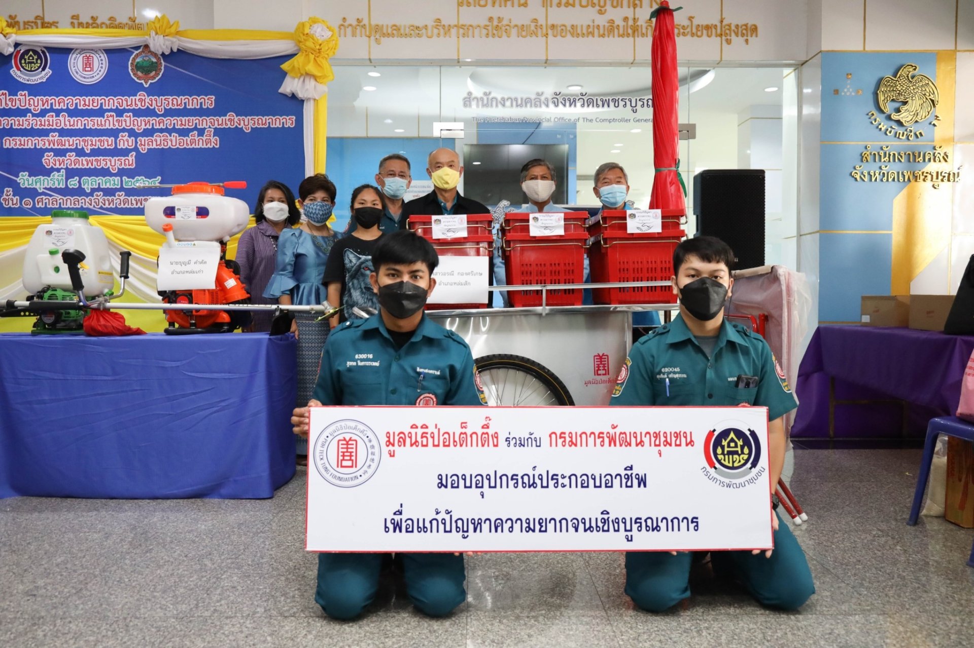 วานนี้ (วันที่ 8 ตุลาคม 64) มูลนิธิป่อเต็กตึ๊ง โดย นายสุรพงษ์ เตชะหรูวิจิตร กรรมการและรองเลขาธิการ เป็นประธานในพิธี พร้อมด้วยนายพินัย ศรีพนาสณฑ์ ผู้จัดการฝ่ายสังคมสงเคราะห์ และทีมงานแผนกสังคมสงเคราะห์ ร่วมในพิธีมอบอุปกรณ์การประกอบอาชีพให้กับครัวเรือนยากจนในพื้นที่จังหวัดเพชรบูรณ์ จำนวน 3 ครัวเรือน เพื่อส่งเสริมและสนับสนุนอาชีพแก่ครัวเรือนยากจนสามารถประกอบอาชีพเลี้ยงตนเองและครอบครัว ดำเนินชีวิตตามหลักปรัชญาเศรษฐกิจพอเพียง ภายใต้ ”บันทึกข้อตกลงความร่วมมือการแก้ไขปัญหาความยากจนเชิงบูรณาการ” ร่วมกับกรมการพัฒนาชุมชน กระทรวงมหาดไทย โดยมี นายนิเวศน์ หาญสมุทร์ รองผู้ว่าราชการจังหวัดเพชรบูรณ์ พร้อมด้วยนางสาวชนมณัฐ รอดบุญธรรม หัวหน้าผู้ตรวจราชการกรมการพัฒนาชุมชน กระทรวงมหาดไทย ร่วมเป็นประธานในพิธี พร้อมด้วย นายชาญชัย เพชรสุขศิริ นายกสมาคมพาณิชย์พ้งไล้จับซาเซียวเกาะ จังหวัดเพชรบูรณ์ และคณะ ร่วมในพิธี ณ ศาลากลางจังหวัดเพชรบูรณ์ อำเภอเมืองเพชรบูรณ์ จังหวัดเพชรบูรณ์