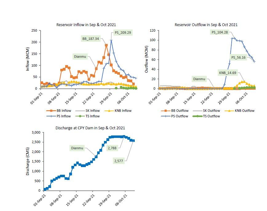นอกจากนี้ เมื่อทำการวิเคราะห์แนวทางการบริหารเขื่อนในช่วงต้นสัปดาห์ที่ผ่านมา จากข้อมูลปริมาณการระบายน้ำรายวัน (Reservoir Outflow) พบว่า ทุกเขื่อนหลักในลุ่มน้ำเจ้าพระยาใหญ่ยังคงกำหนดการระบายน้ำขั้นต่ำ เพื่อลดผลกระทบทางด้านท้ายน้ำ ยกเว้นเขื่อนป่าสักชลสิทธิ์และเขื่อนทับเสลาที่มีการปรับเพิ่มปริมาณการระบายน้ำจากสถานะปริมาตรน้ำเก็บกักที่เต็มความจุหลังเกิดพายุเตี้ยนหมู่ โดยปริมาณการระบายน้ำของเขื่อนป่าสักชลสิทธิ์สูงสุดถึง 104.28 ล้านลูกบาศก์เมตรต่อวัน เมื่อวันที่ 1 ตุลาคม และได้มีการปรับลดปริมาณการระบายน้ำลงอย่างต่อเนื่องหลังจากนั้น ซึ่งเป็นไปในทำนองเดียวกันกับแนวโน้มการระบายน้ำของเขื่อนทดน้ำเจ้าพระยาที่มีการปรับลดปริมาณการระบายน้ำลงเหลือ 2,577 ลูกบาศก์เมตรต่อวินาที เมื่อวันที่ 8 ตุลาคมที่ผ่านมา