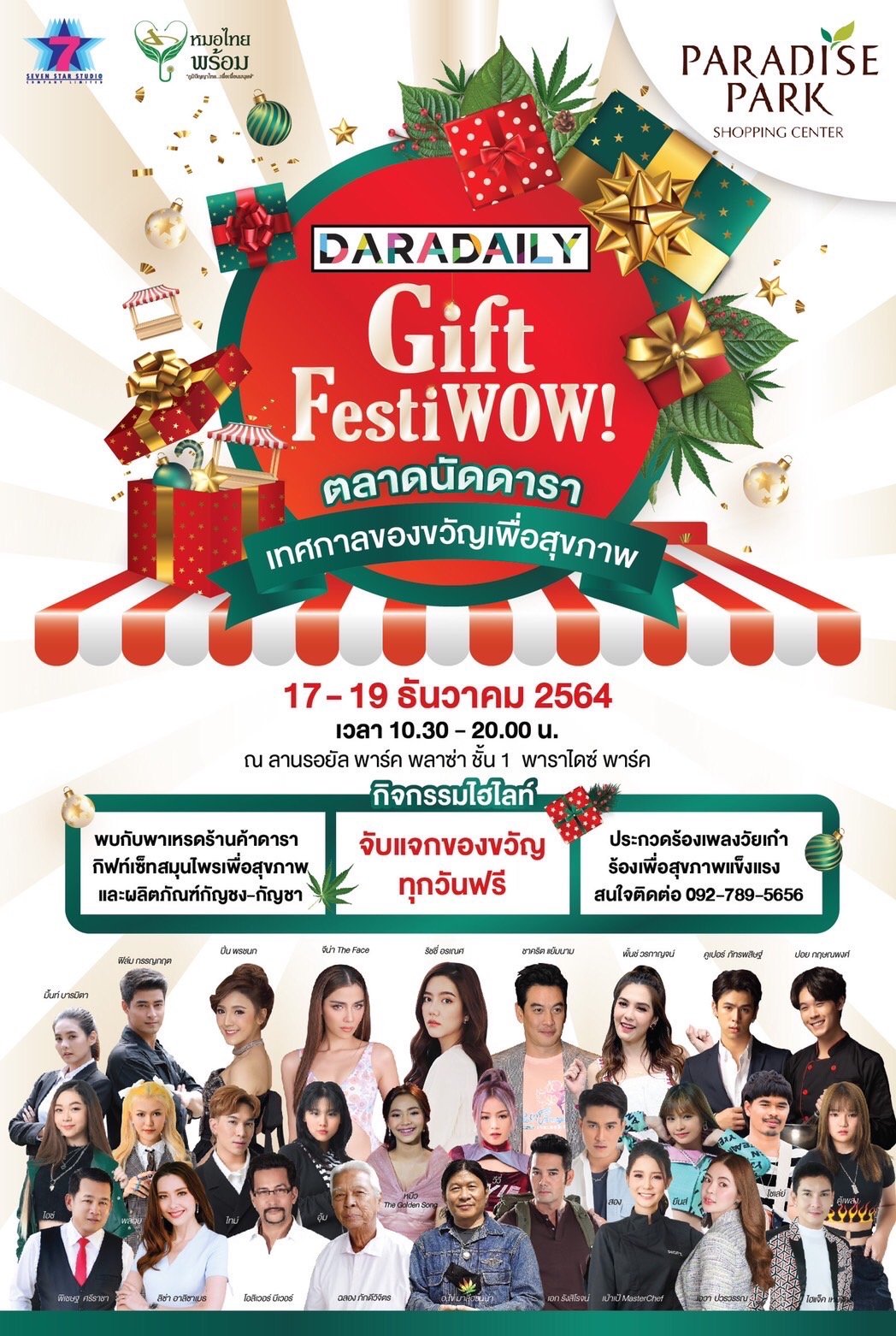 ร่วมเฉลิมฉลองส่งท้ายปีต้อนรับปีใหม่ ล่าสุด ศูนย์การค้าพาราไดซ์ พาร์ค ร่วมกับ บริษัท เซเว่น สตาร์ สตูดิโอ จำกัด และ บริษัท ดาราเดลี่ จำกัด จัดงาน “DARADAILY Gift FestiWOW!” ตลาดนัดดารา เทศกาลของขวัญ ระหว่างวันที่ 17 - 19 ธันวาคม 2564 โดยได้รับเกียรติจาก รัฐมนตรีช่วยว่าการกระทรวงสาธารณสุข “ดร.สาธิต ปิตุเตชะ” เป็นประธานพิธีเปิดงานในวันที่ 17 ธันวาคม 2564 เวลา 15.00 น.