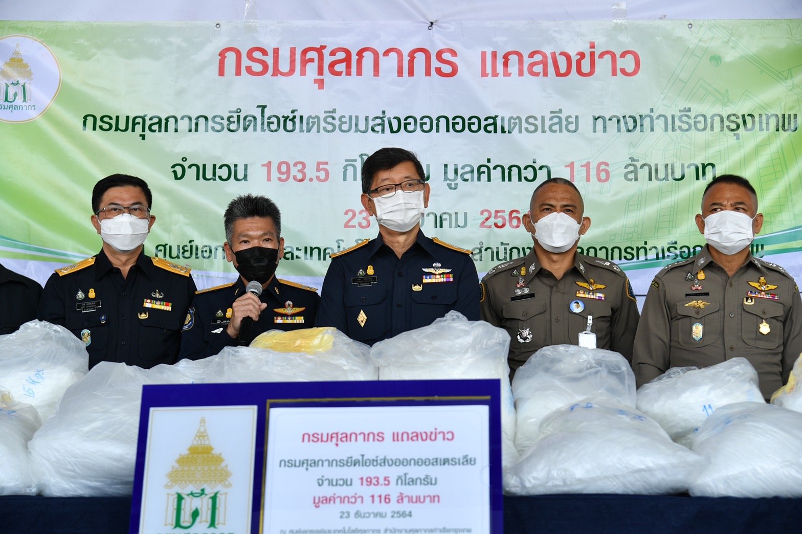 นายพชร อนันตศิลป์ อธิบดีกรมศุลกากร พร้อมด้วยผู้แทนจากสำนักงานคณะกรรมการป้องกันและปราบปรามยาเสพติด (ป.ป.ส.) ตำรวจปราบปรามยาเสพติด (ปส.) ตัวแทนสถานเอกอัครราชทูตออสเตรเลีย ประจำประเทศไทย และหน่วยงานที่เกี่ยวข้อง แถลงผลการตรวจยึดยาไอซ์ น้ำหนัก 193.5 กิโลกรัม มูลค่ากว่า 116 ล้านบาท