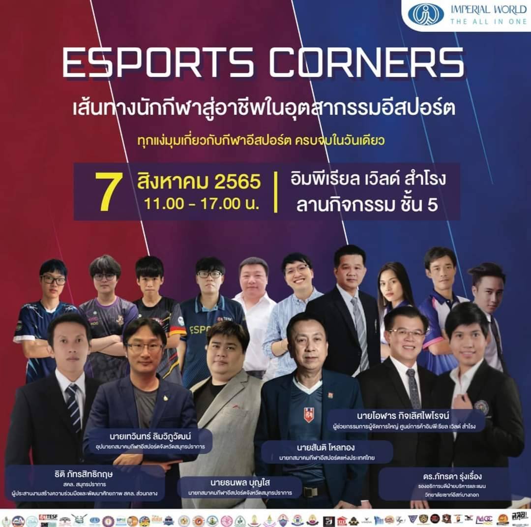 เมื่อวันที่ 7 สิงหาคม 2565 ณ ห้างสรรพสินค้าอิมพีเรียลเวริ์ล สำโรง ชั้น 5 สมาคมกีฬาอรสปอร์ต จังหวัดสมุทรปราการ จัดงาน Esports Corners เพื่อเปิดเวทีคัดตัวนักกีฬา efootball หรือ PES ตัวแทนจังหวัดสมุทรปราการ โดยนายธนพล บุญใส นายกสมาคมกีฬาอรสปอร์ต จังหวัดสมุทรปราการ เผยว่าต้องขอขอบคุณนายสันติ โหลทอง นายกสมาคมกีฬาอีสปอร์ตแห่งประเทศไทย ที่ได้ให้การสนับสนุนเป็นหนึ่งในวิทยากรให้ความรู้รวมถึงทิศทางกีฬาอีสปอร์ต ที่สามารถเป็นอาชีพและนักกีฬาติดทีมชาติไทยได้ และขอบคุณนายโอฬาร กิจเลิศไพโรจน์ ผู้ช่วยกรรมการผู้จัดการใหญ่ ศูนย์การค้าอิมพีเรียลเวิลด์ สำโรง ที่เอื้อเฟื้อสถานที่ ในการผลักดันเยาวชนชาวปากน้ำไปสู่ความฝัน